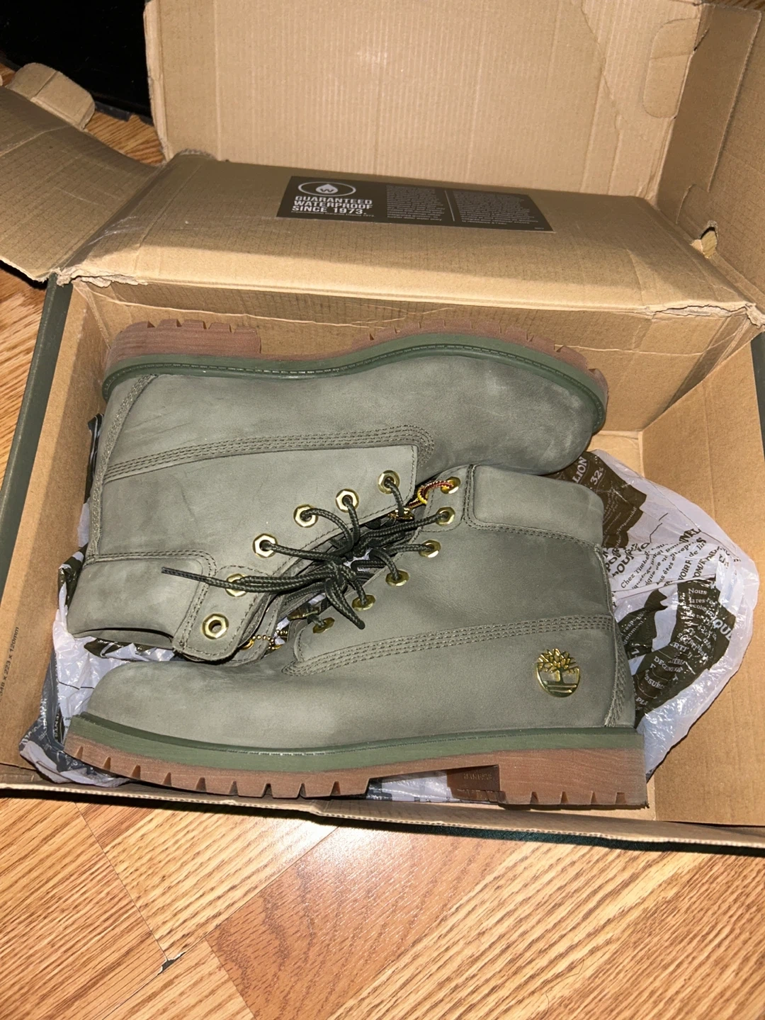 140Selling a pair of Timberland Premium 6" Waterproof Boots in dark green nubuck, size 6. These boots are in great condition and come with the original box. They are a classic and durable choice for any wardrobe! i only wear them 3 times