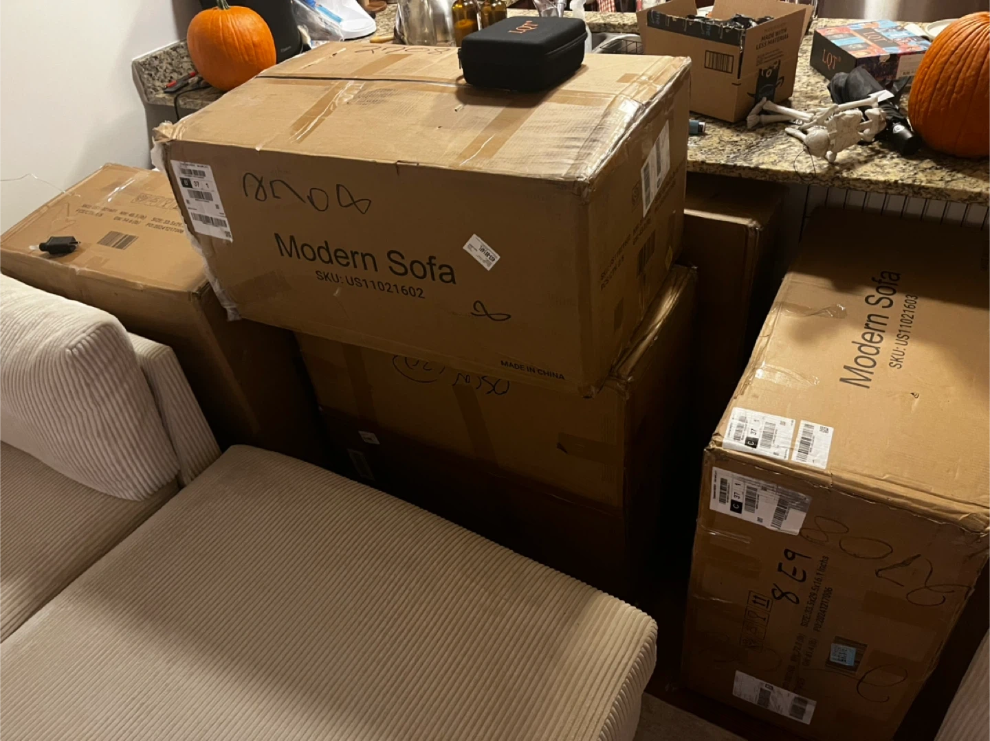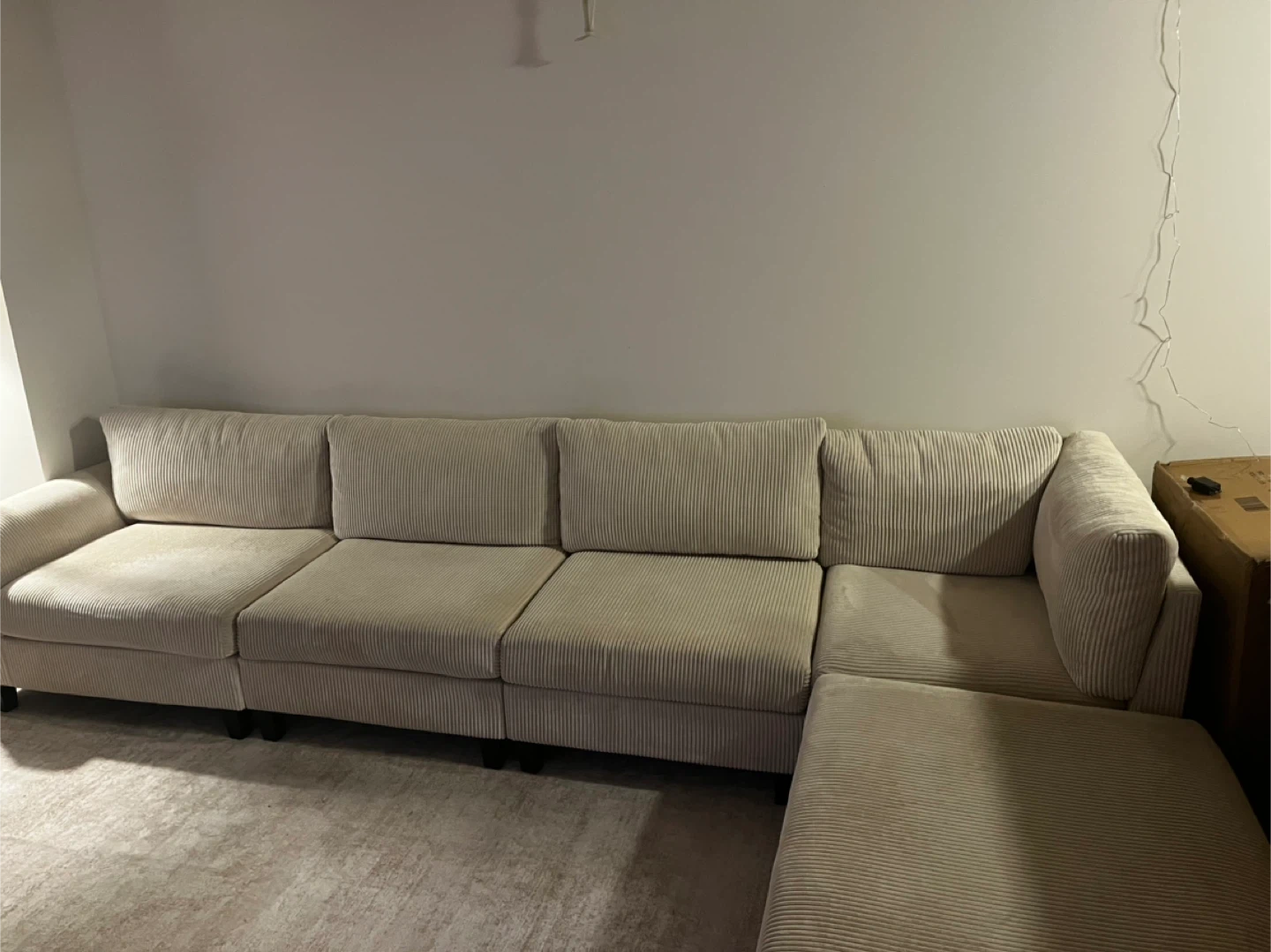 Selling a modern sofa that's a L-shaped corner sectional! It features a modular sofa bed design with upholstered back and square arms. The frame is made of solid wood, and the upholstery material is corduroy with a matching texture. It also comes with 5 accent pillows and black legs