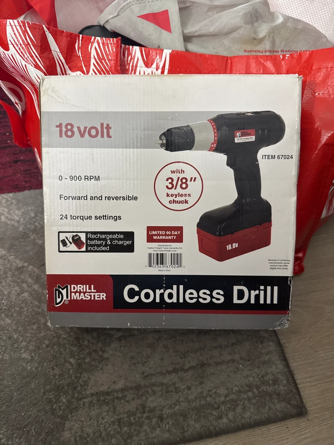 60Selling a Drill Master Cordless Drill, brand new in the box! It's an 18 volt drill with a 3/8" keyless chuck. It features forward and reversible settings and has 24 torque settings. The box includes a rechargeable battery and charger