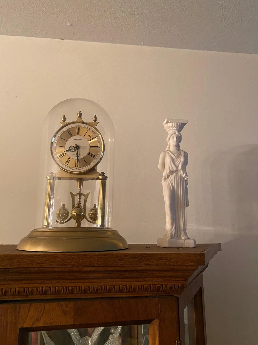 43Selling an anniversary clock with a glass dome. It's in good condition and would look great in any room!