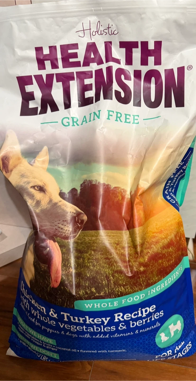 Selling a bag of Health Extension Grain Free dog food! It's a Chicken & Turkey Recipe with whole vegetables & berries, perfect for all life stages. The bag is 23.5 LBS (10.66 kg). It's made with whole vegetables & fruits, coconut oil, and flavored with turmeric, plus added vitamins & minerals.