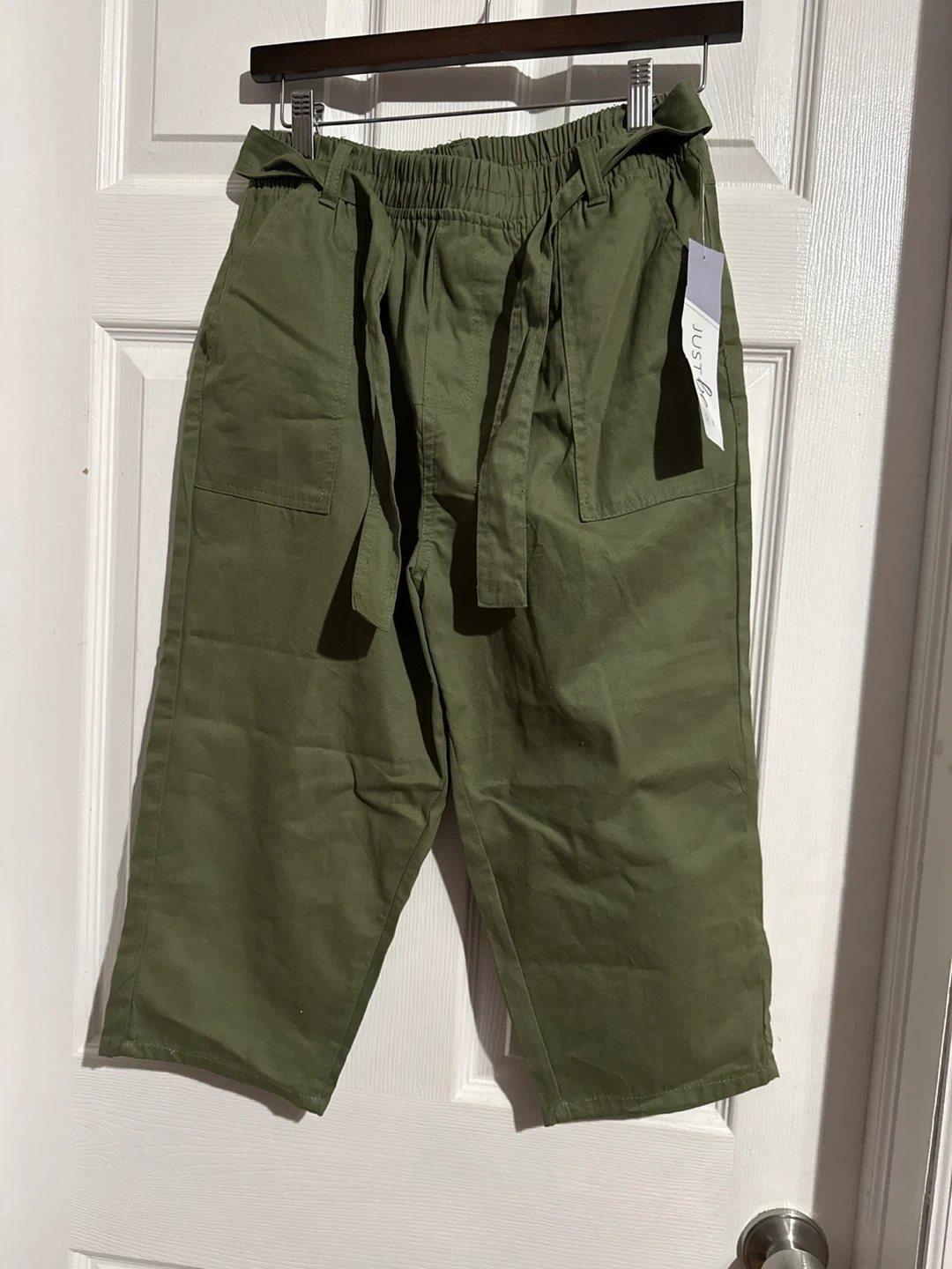 These are a pair of olive green cropped pants from JUST be. They feature a comfortable elastic waistband and a stylish self-tie belt. Perfect for a casual and comfortable look!