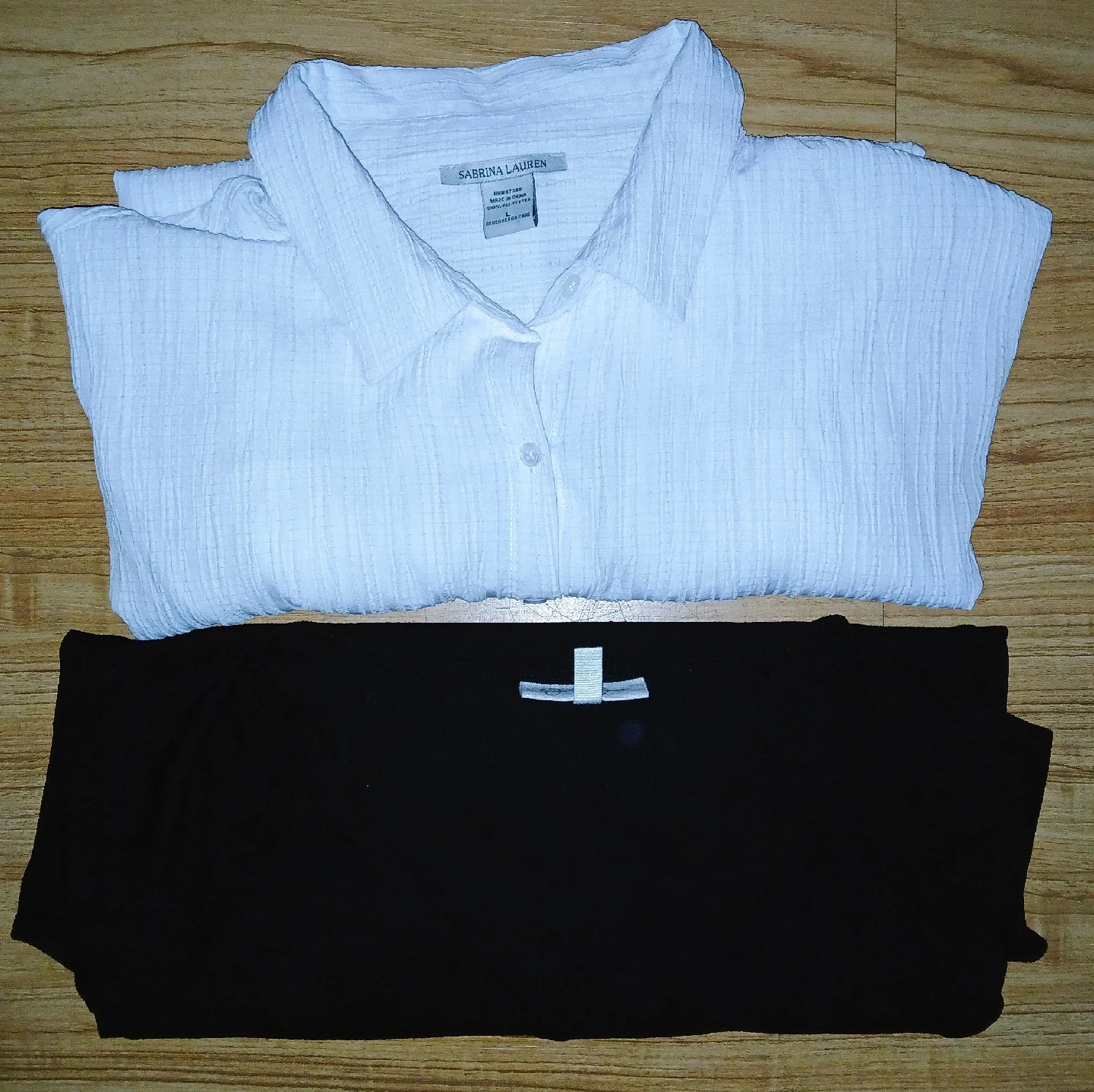 1000+Selling a set of two shirts! One is a white button-down shirt and the other is a black bodysuit. Both are size L and from Sabrina Lauren