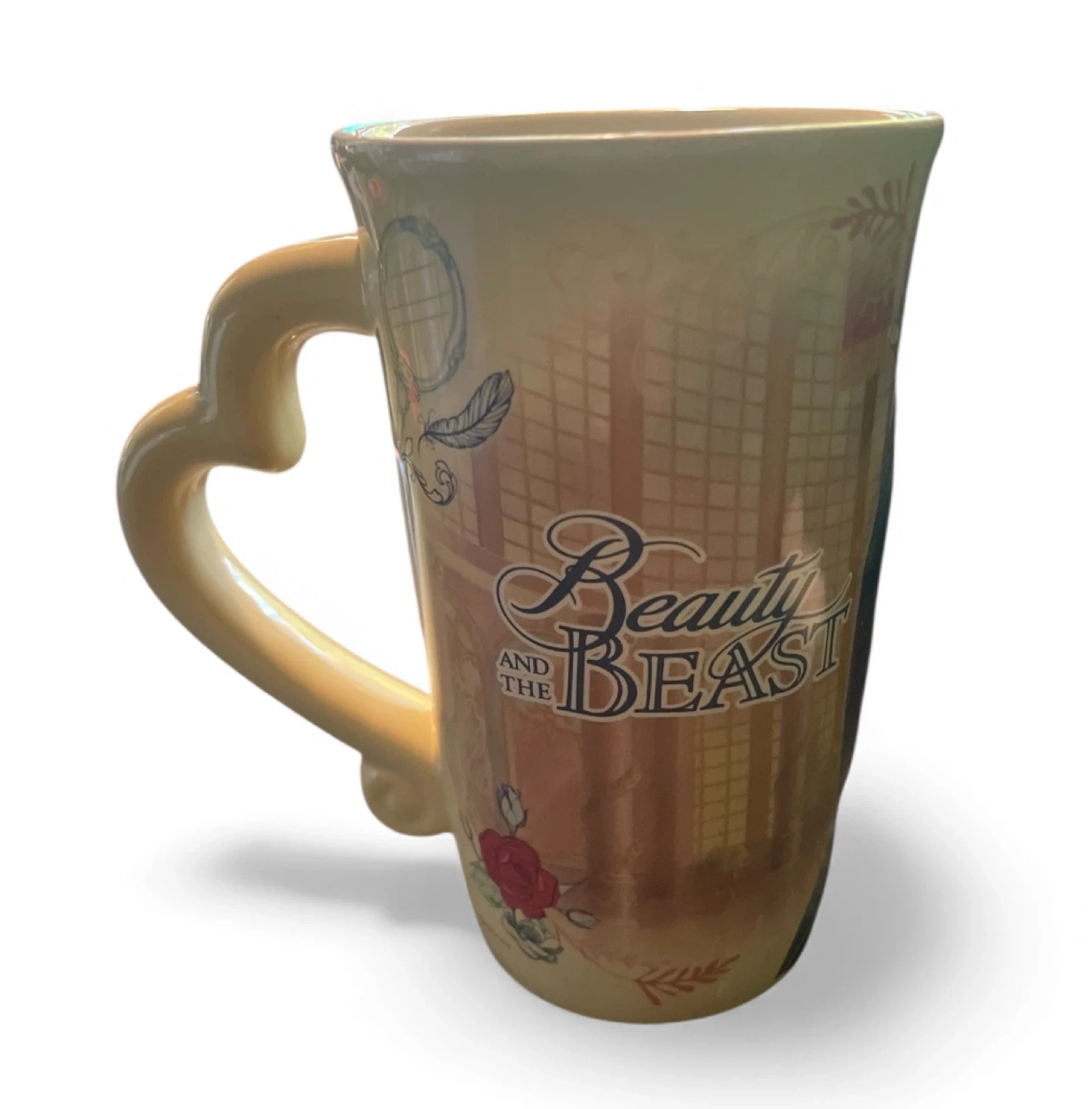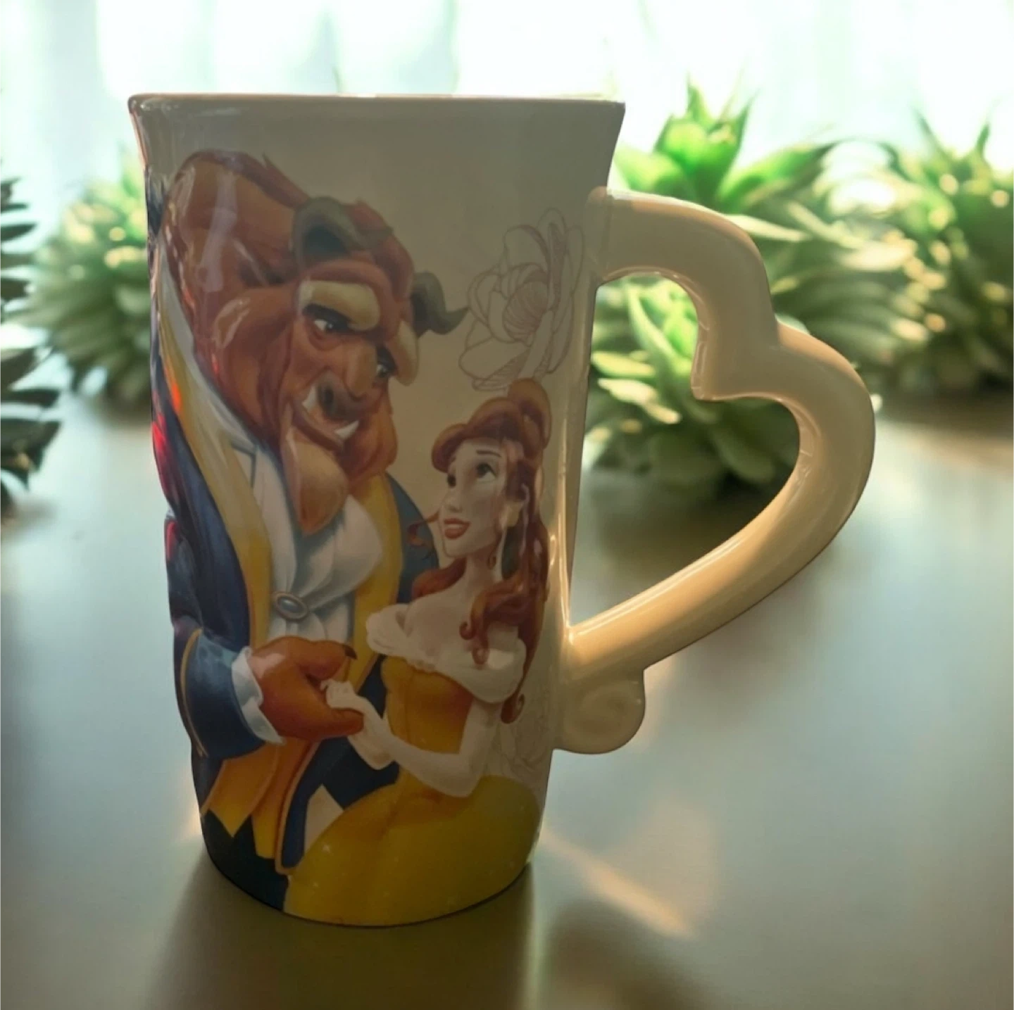 23A charming Beauty and the Beast coffee mug! It has a heart-shaped handle and features Belle and the Beast. Perfect for any Disney fan!