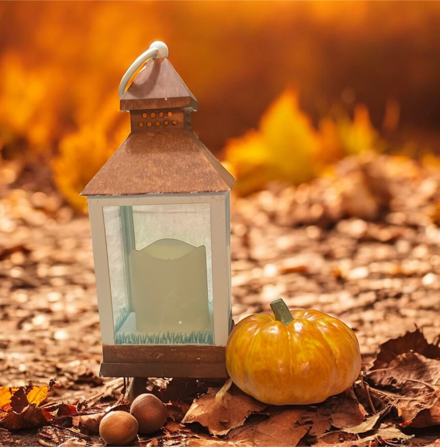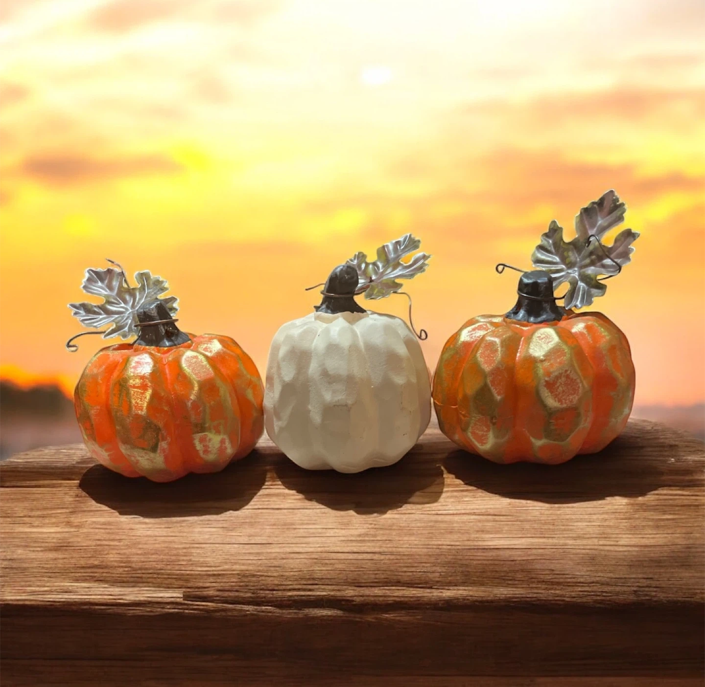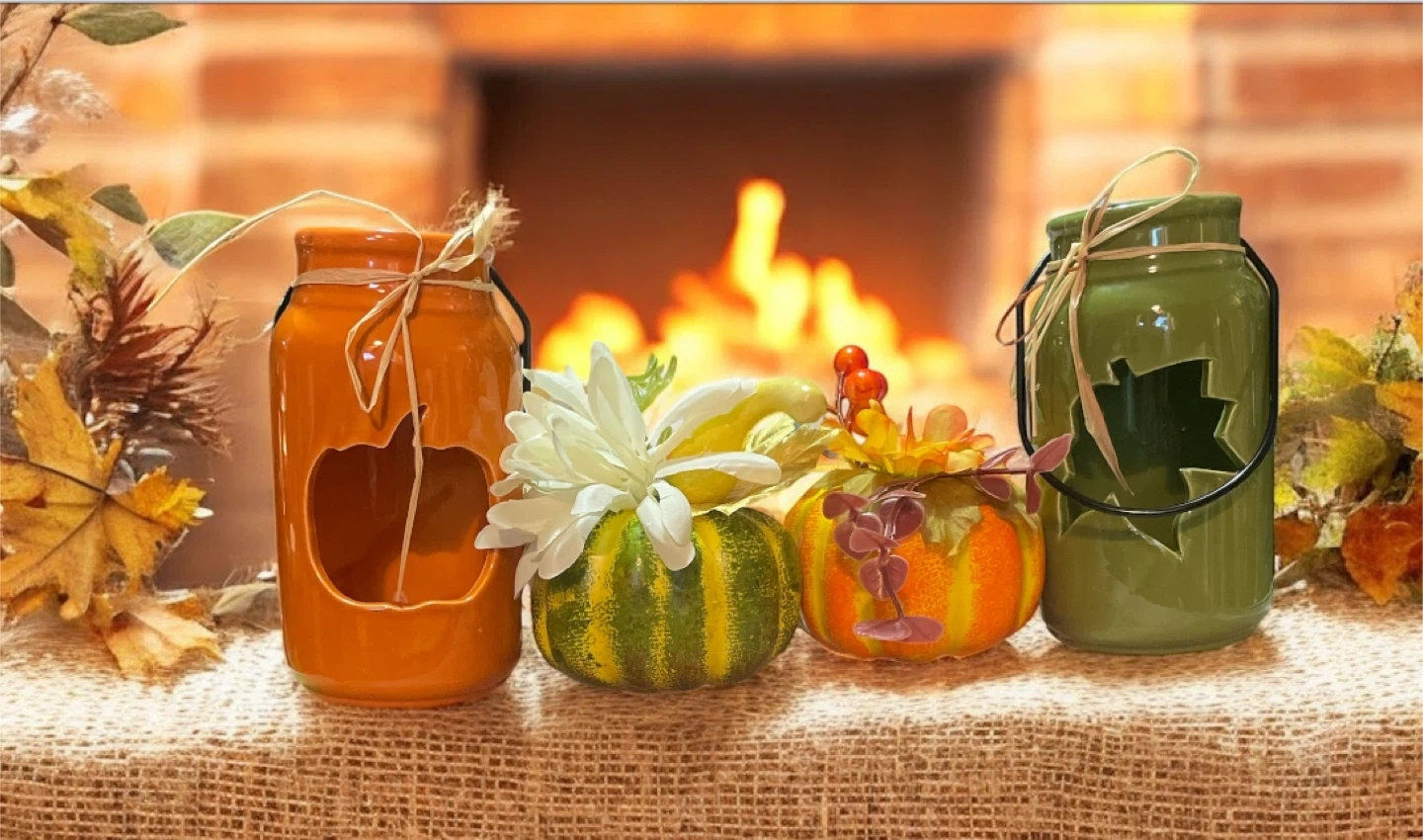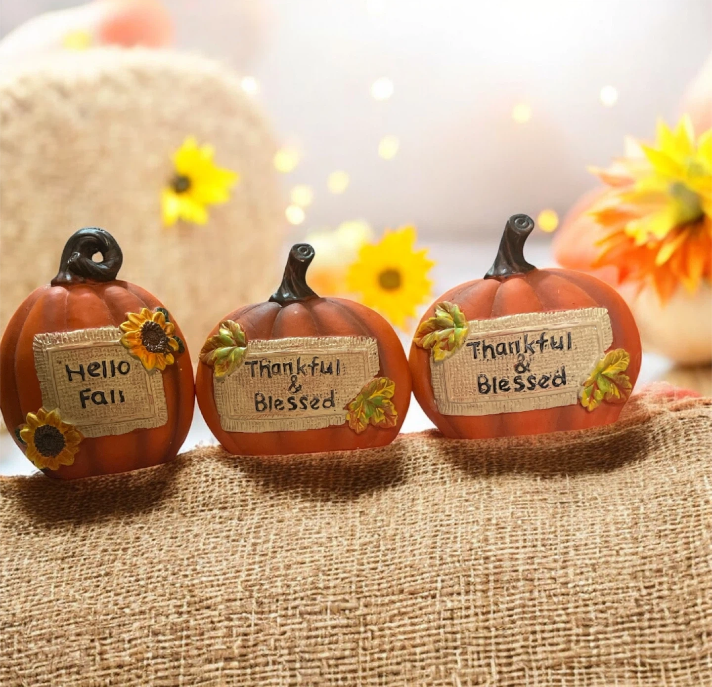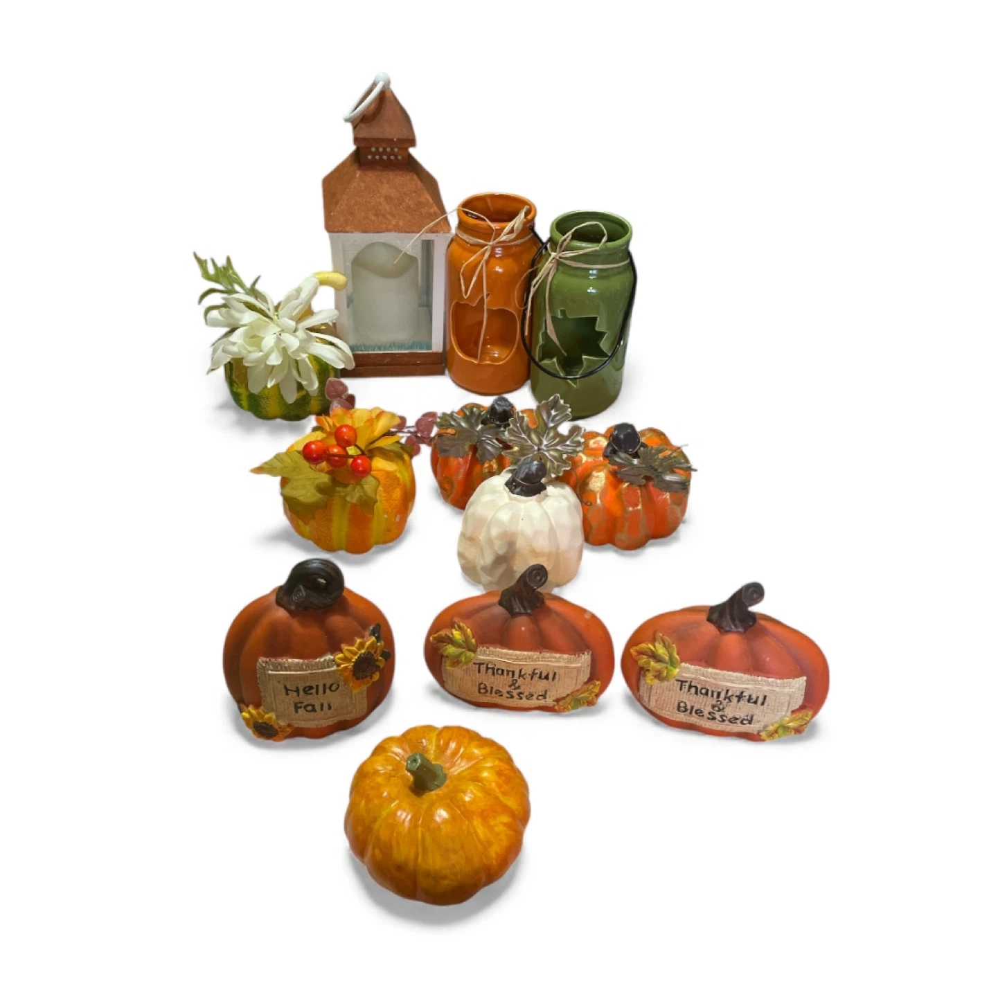 23This is a collection of fall and harvest-themed home decor items. The set includes a lantern, two decorative glass jars, and several small pumpkin and gourd figurines. Some of the pumpkins have text on them, such as "Hello Fall" and "Thankful Blessed". The items are typically used for tabletop or mantelpiece decorations during the autumn season. Add a touch of autumn charm to your home with these adorable pumpkin figurines! They come in a variety of colors and designs, perfect for sprucing up your fall decor. $12 for everything.