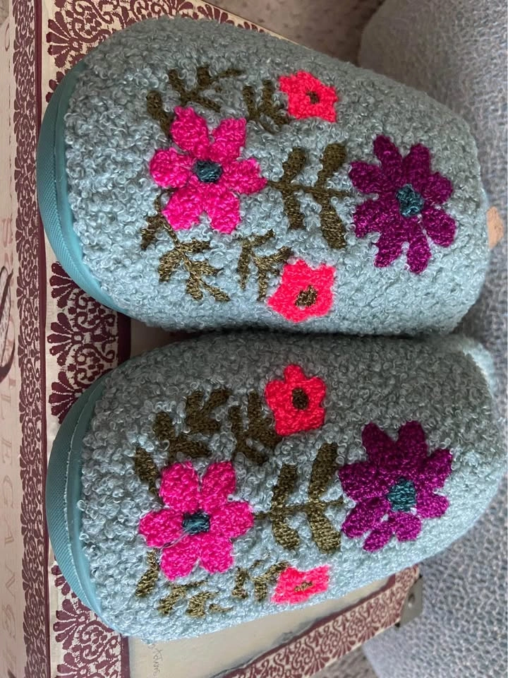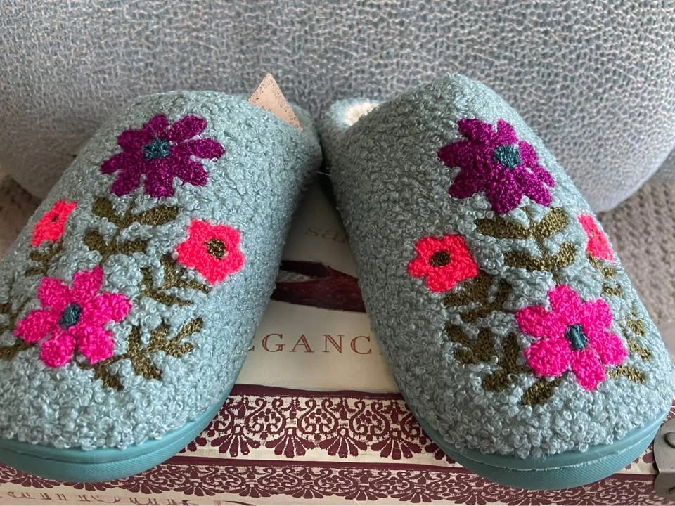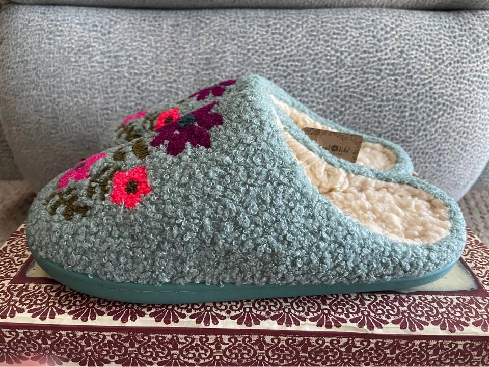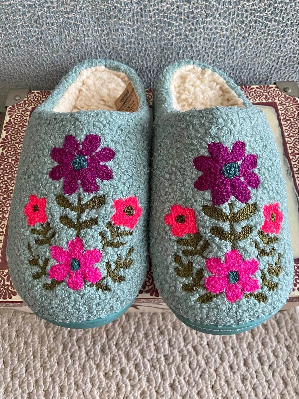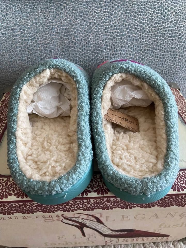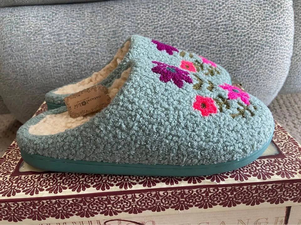 65Women’s Natural Life Folk Floral Slippers, in Dusty Blue. *New with Tag. Cozy, soft Sherpa lining, boucle floral embroidery on outer. Hard rubber outsole. 100% polyester, spot clean. Original $36. *NOTE…These slippers run an entire size small. They are marked as 9-10, however, THESE FIT A SIZE 7-8. My daughter is a 7.5, and these fit her perfectly. I’m a size 9.5, and these are way too small for me. Can absolutely try on with a sock at meeting place! Cash only. Meet in Garfield Ridge, Chicago, near Midway. Willing to meet near Oak Lawn, EP, Alsip ☺️