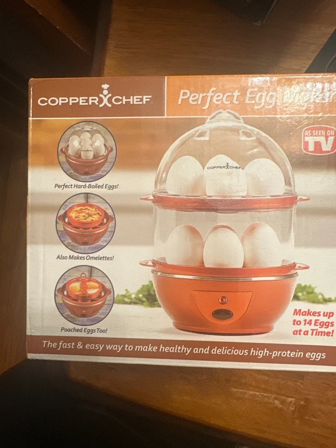I'm selling a Copper Chef Perfect Egg Maker. It includes all this: 2 egg trays, see-through lid with steam vents, poaching tray, omelette tray, extension ring, measuring cup, and power base. It makes up to 14 eggs at a time! It's the fast and easy way to make healthy and delicious high-protein eggs