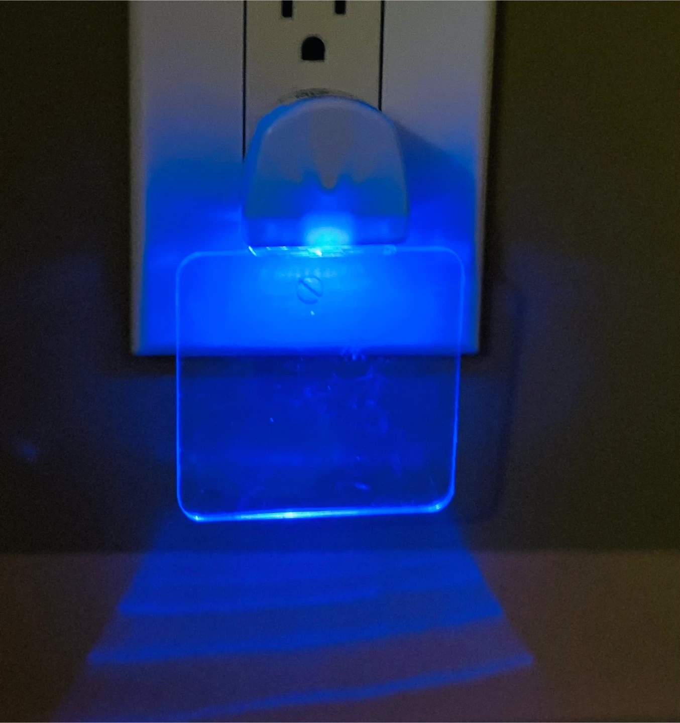 51This is a blue LED night light. It plugs directly into a wall outlet and emits a soft blue glow. Perfect for a child's room or hallway!
