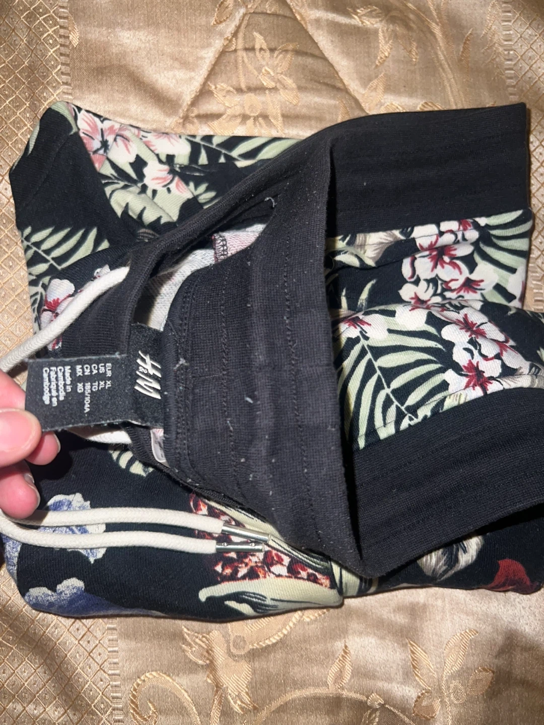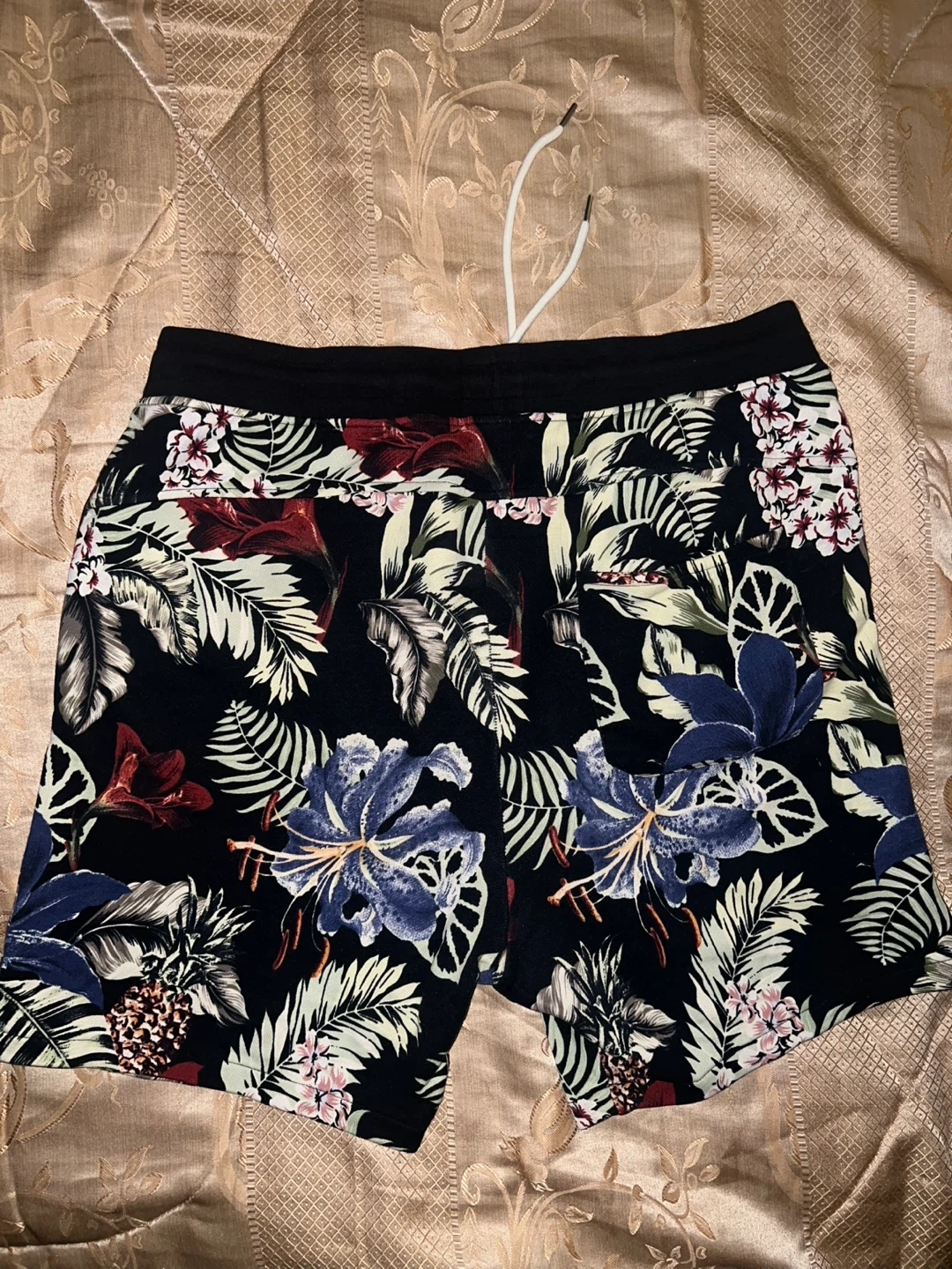232Pre-owned SIZE XL H&M Mens shorts in black w a floral pattern that have a drawstring, side and a back pocket Please message before buying