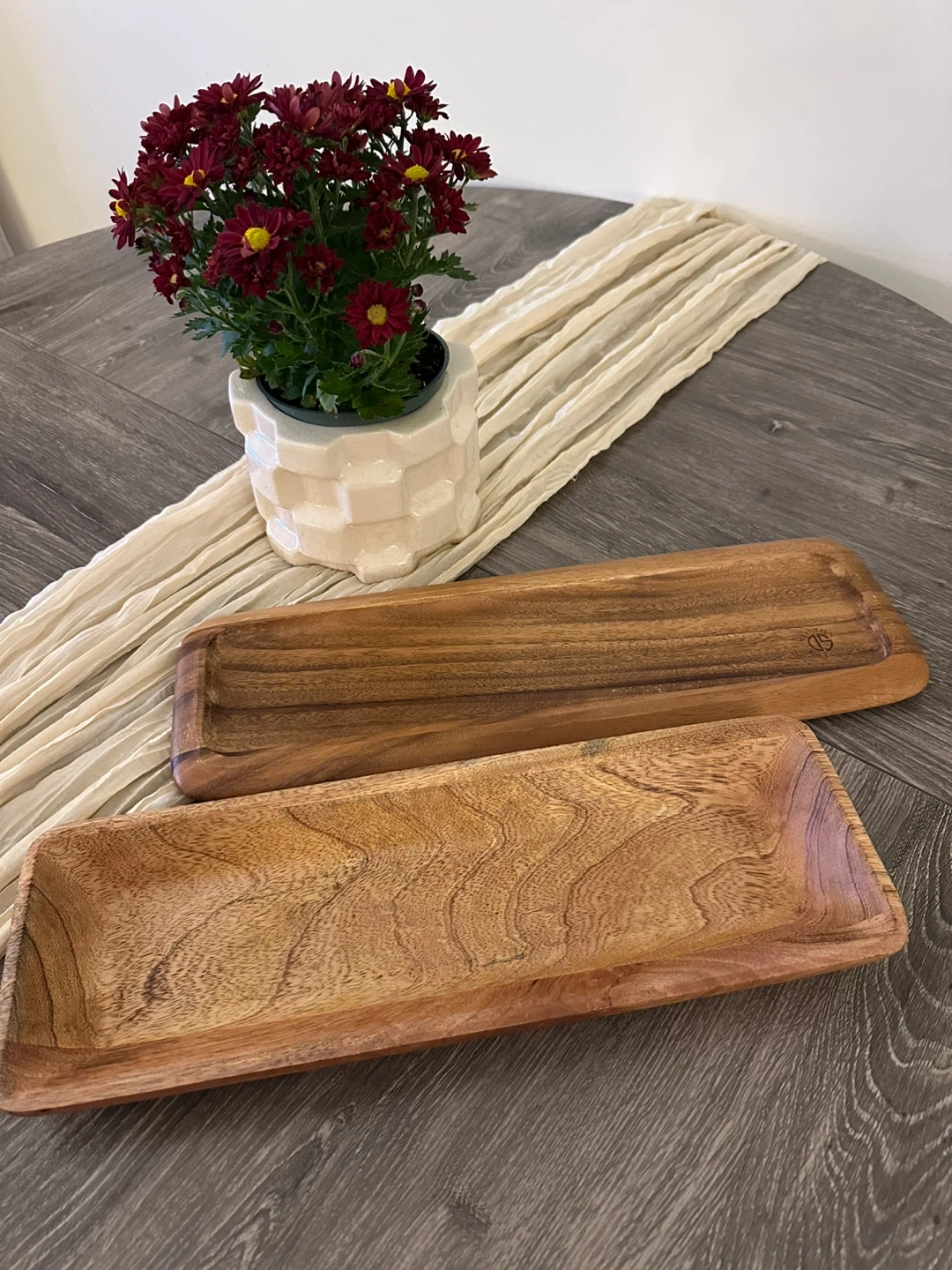 Selling a set of two wooden serving trays. They're perfect for serving snacks, appetizers, or drinks. The natural wood grain adds a touch of rustic charm to any table setting. Great for everyday use or special occasions!
