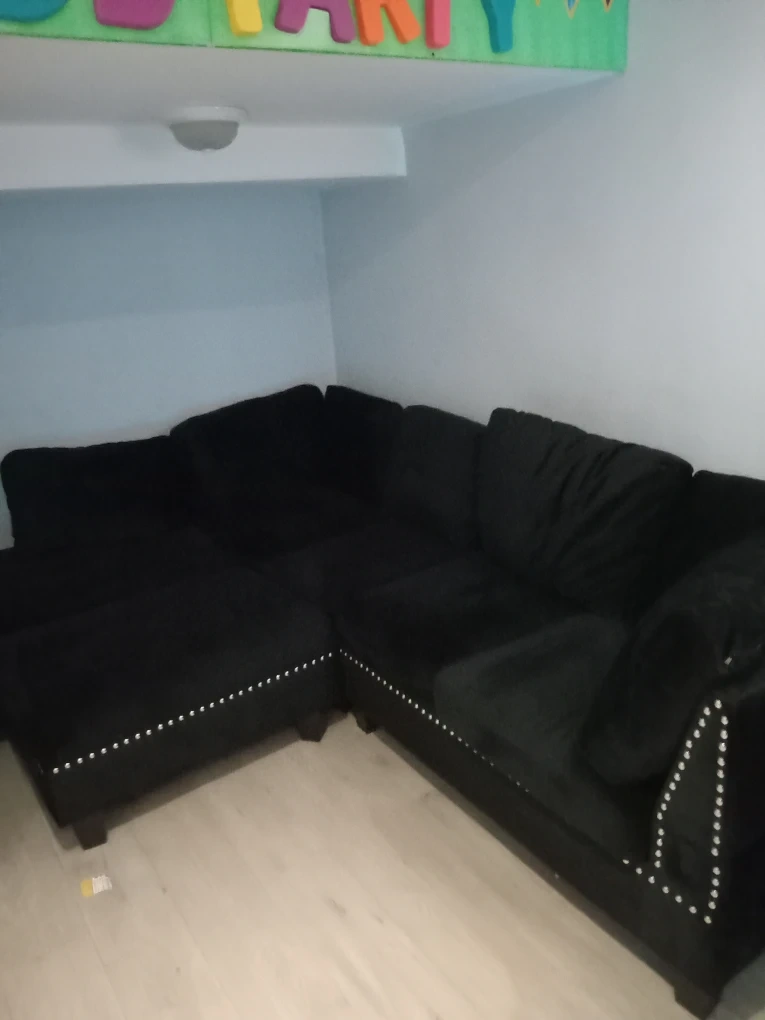 15Selling a comfy black sectional sofa! It features stylish silver studs along the edges, adding a touch of elegance to your living space. Perfect for lounging and relaxing after a long day. Included - reversible sofa cover, ottoman and 2 accent white pillows