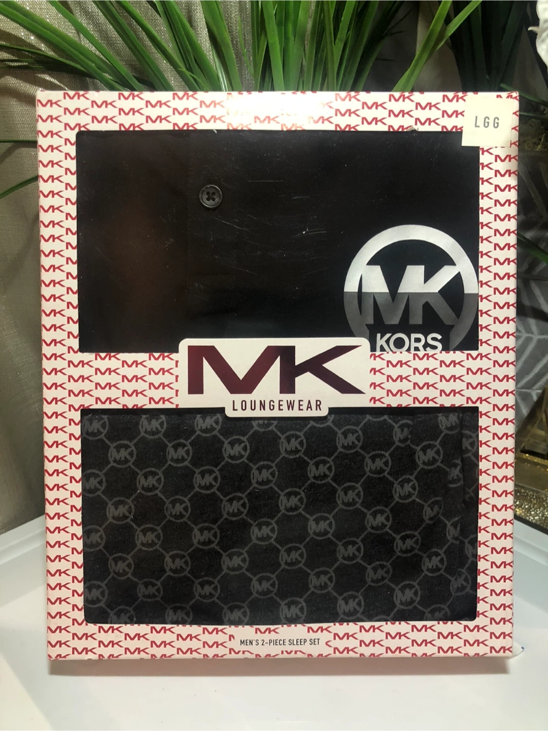 37Selling a Michael Kors men's 2-piece sleep set in size L. The set includes a long-sleeved shirt and pants. The material is 60% cotton and 40% polyester. The original price was $39.50 and comes with the original box