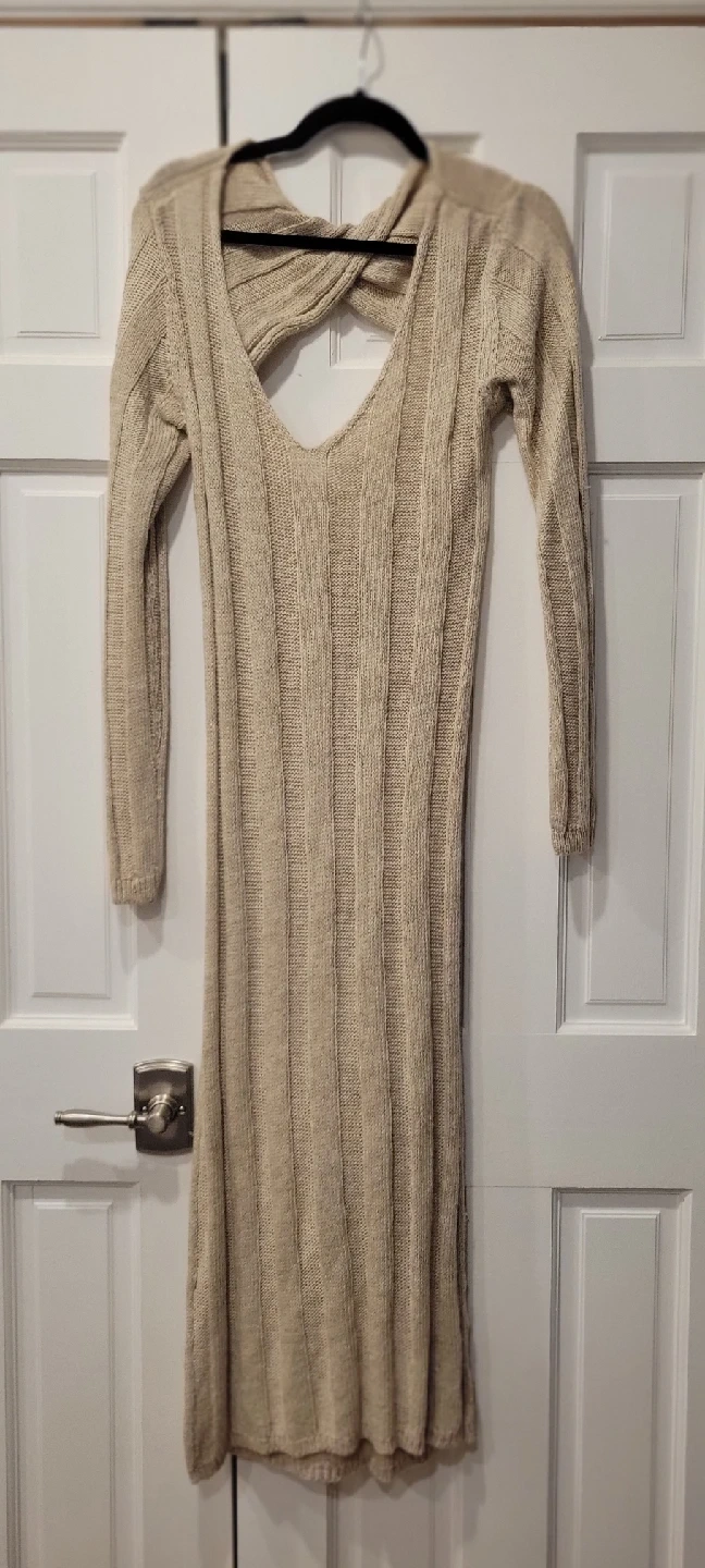 NWT , size Large Cozy up in this Free People knit dress! It features a lovely beige color and a unique design on the back. Perfect for a casual day out or a cozy night in!