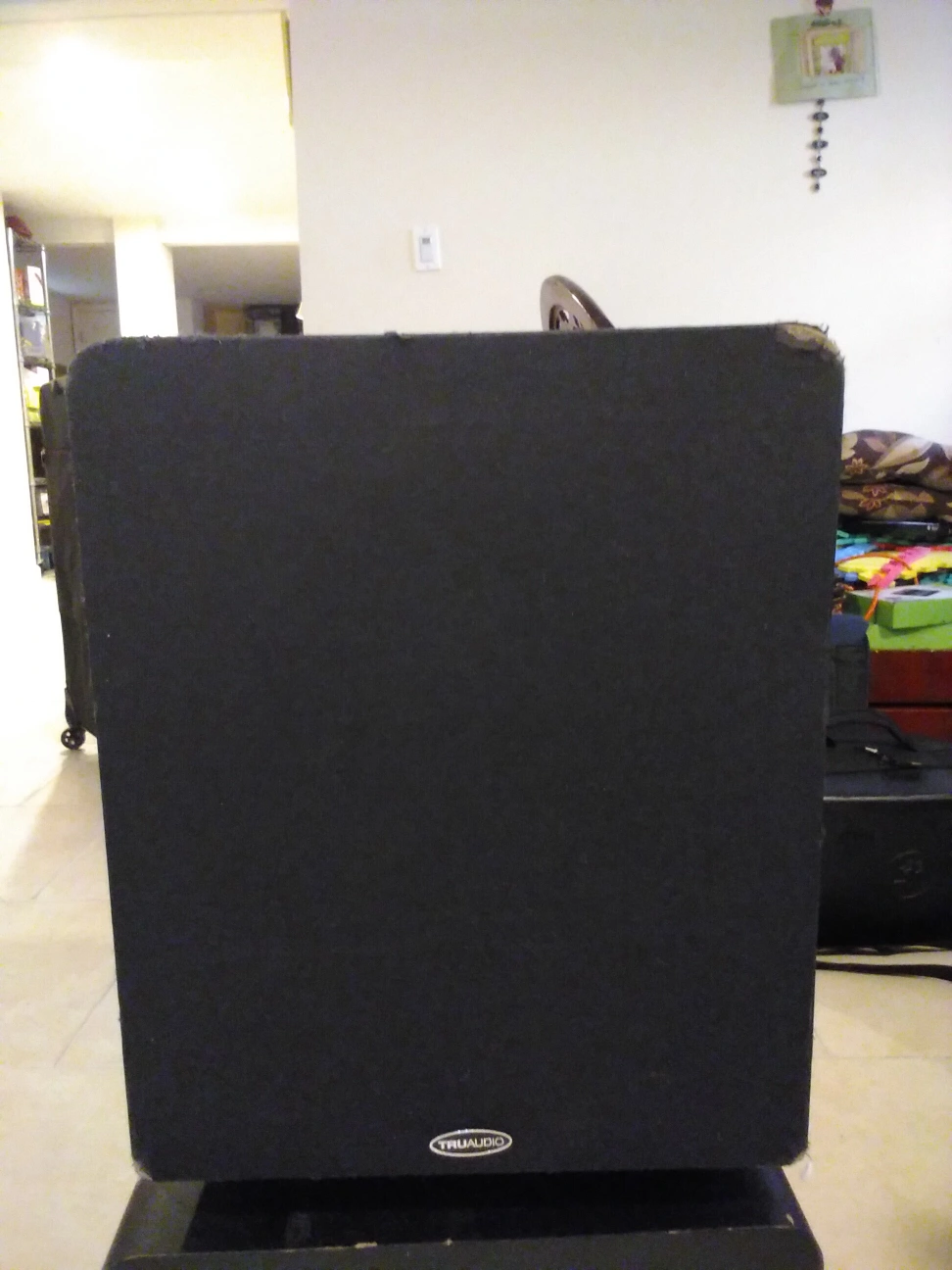 Selling a TruAudio subwoofer in good condition. It features high and low level inputs, volume and frequency controls, and a phase switch. Perfect for enhancing your home audio system!