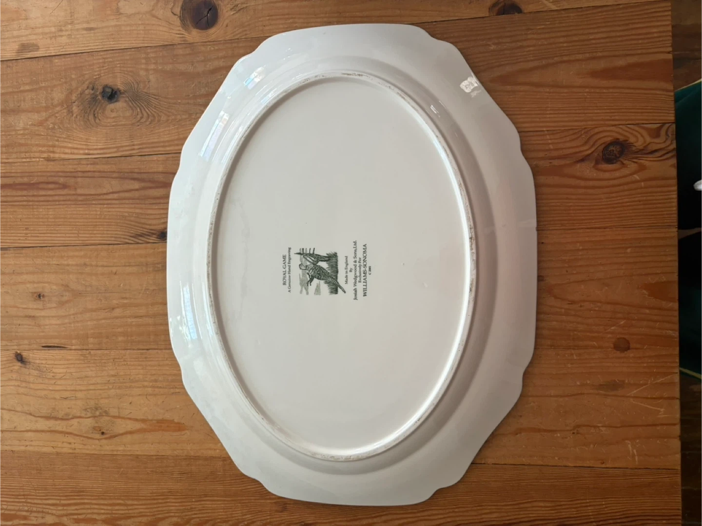 Selling a Royal Game platter by Josiah Wedgwood & Sons, made exclusively for Williams-Sonoma. This platter features a genuine hand engraving of a pheasant scene with a green floral border. A beautiful piece made in England!