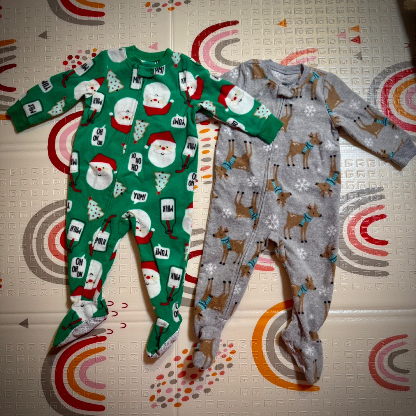 I'm selling two adorable footed pajamas from Simple Joys by Carter's! One is a festive green with Santa and milk designs, and the other is a cozy gray with reindeer. Both are size 12M and perfect for keeping your little one snug and stylish.