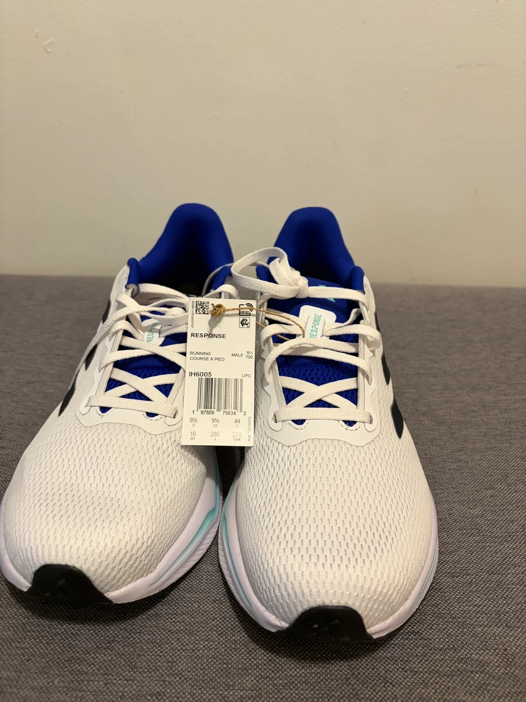 Selling a pair of Adidas Response running shoes in men's size 10. These shoes are perfect for running or everyday wear. They feature a white mesh upper with black Adidas stripes and blue accents. The shoes are in great condition and ready for a new owner!
