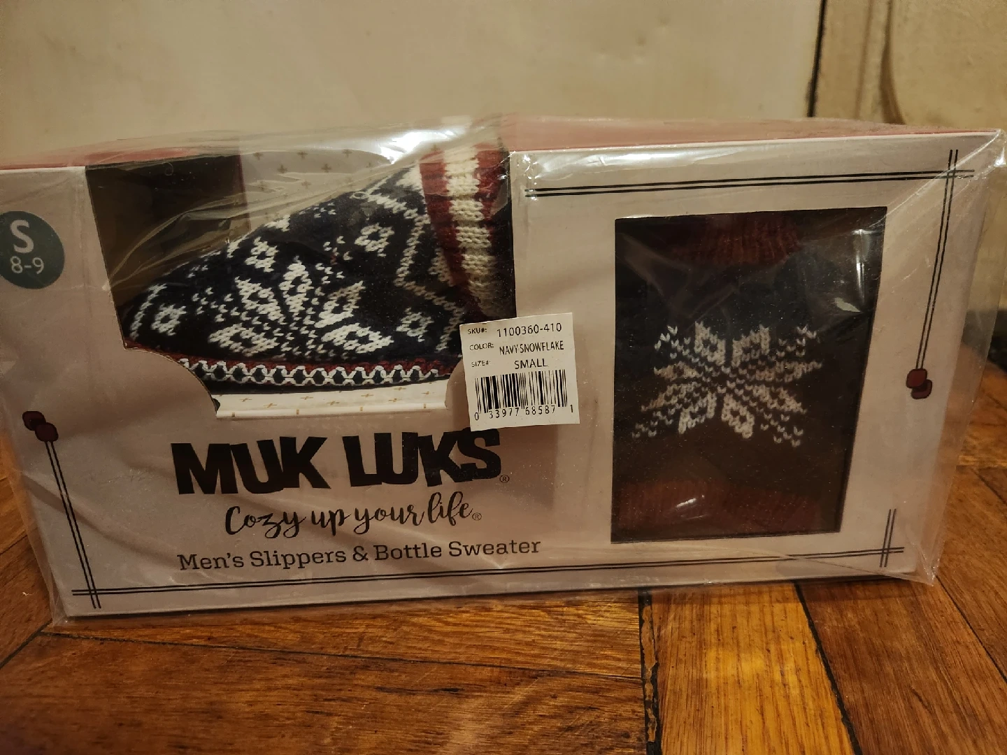 Muk Luks Men's Slippers & Bottle Sweater in size small 8-9. Knit Navy blue Snowflake design with red trim. Features a cozy lining and slip resistant sole. Unopened, NEW IN BOX. Perfect gift for Christmas!