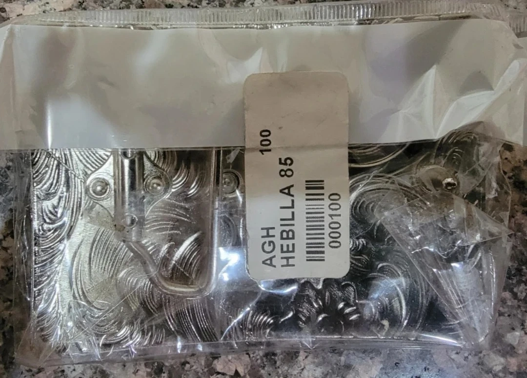Selling a beautiful AGH Hebilla belt buckle. It features a detailed design with a cross and a kneeling figure near a horse. The buckle is silver and gold and comes in its original packaging