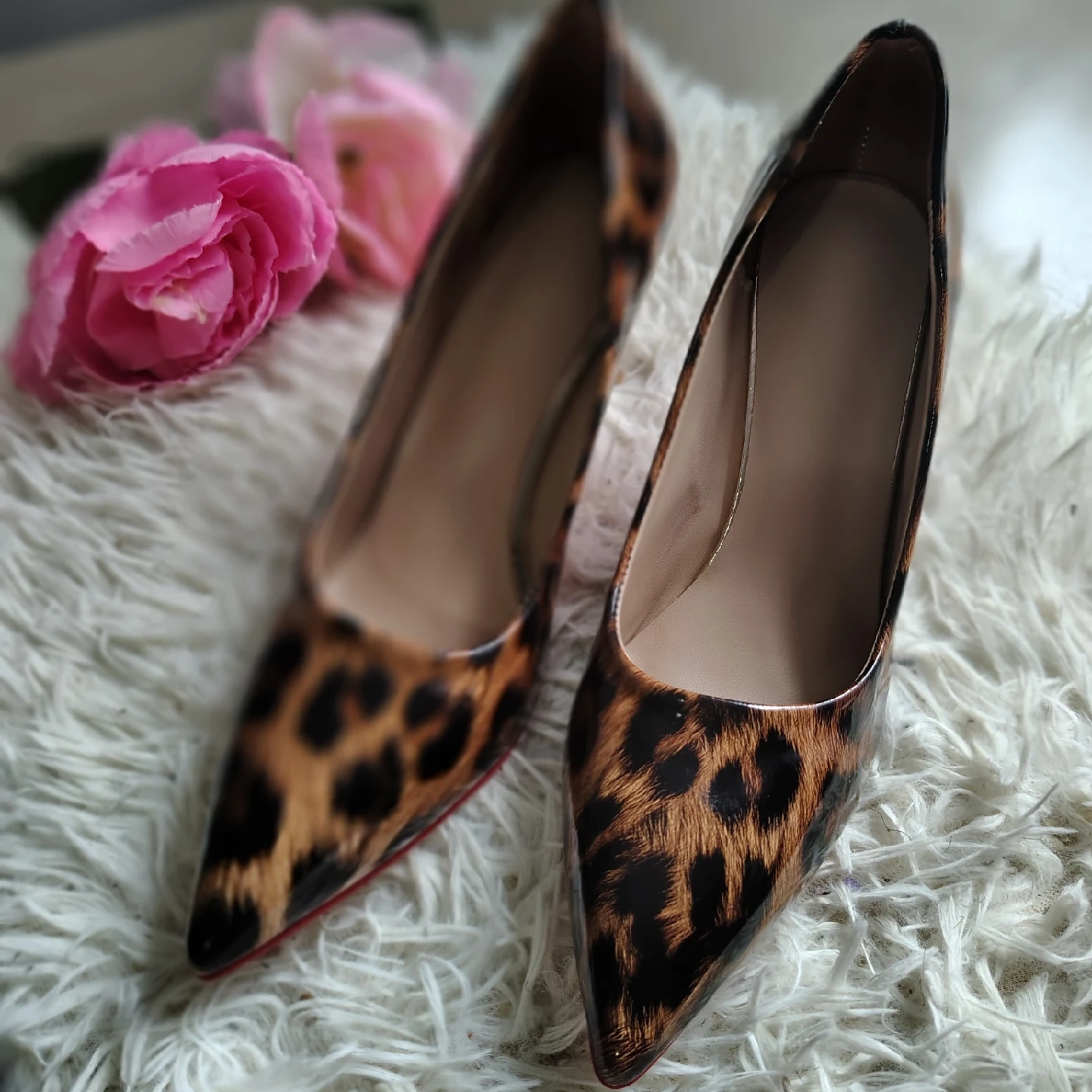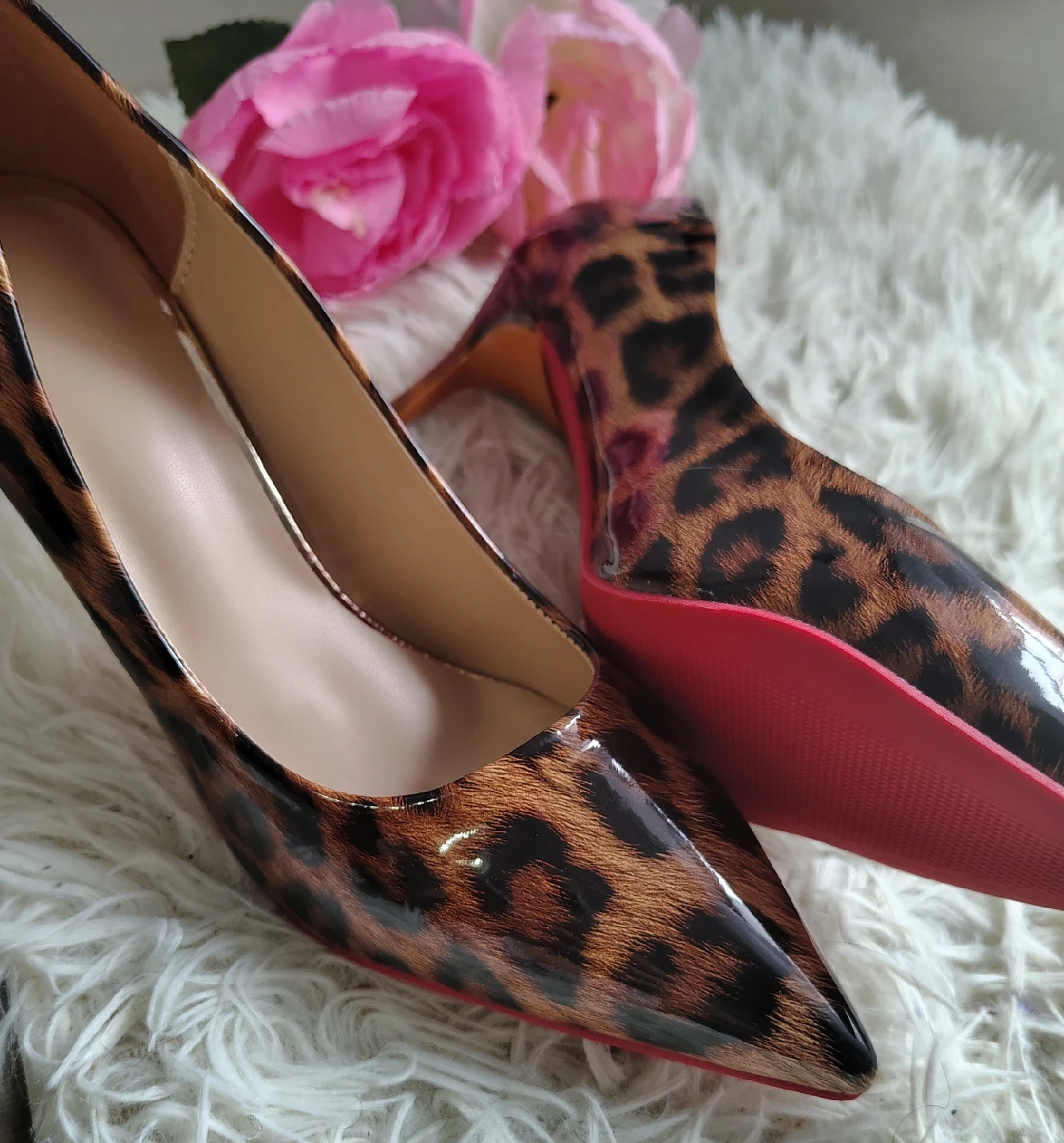 These heels are a stylish statement piece! They feature a bold leopard print and a vibrant red sole. Perfect for adding a touch of wild sophistication to any outfit