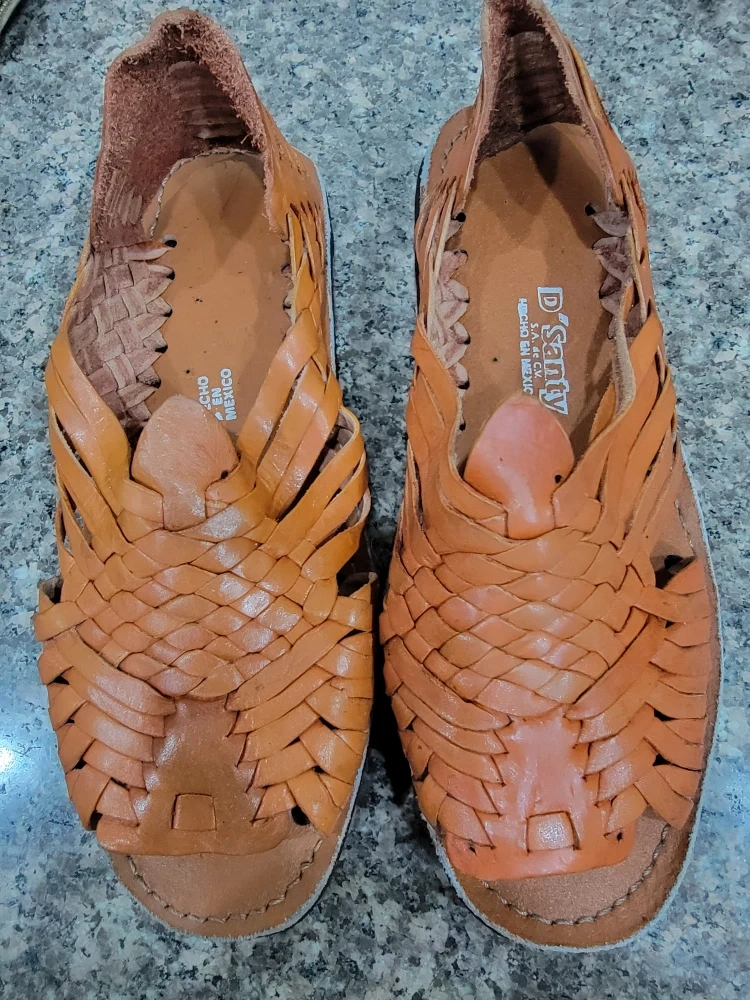 22These are D'Santy Huarache sandals, handmade in Mexico. They're a beautiful orange color and have a woven leather design. Imported from Mexico