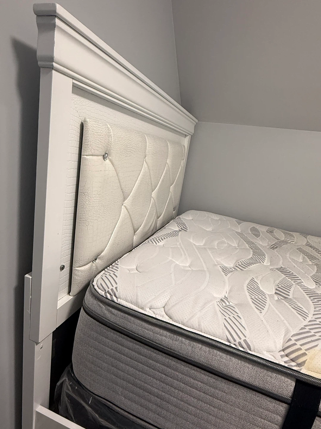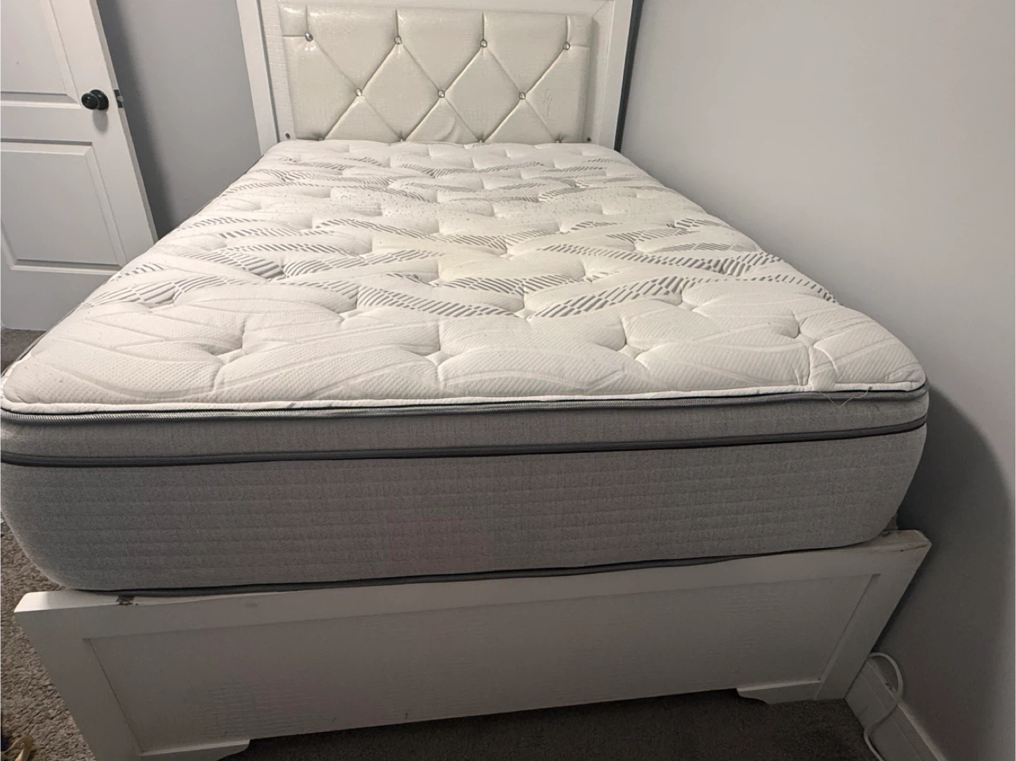 Selling a queen size mattress with a stylish white headboard. The mattress has a white and gray patterned design. There are some visible signs of wear, but it's still comfortable and supportive. Perfect for a guest room or a starter bed!