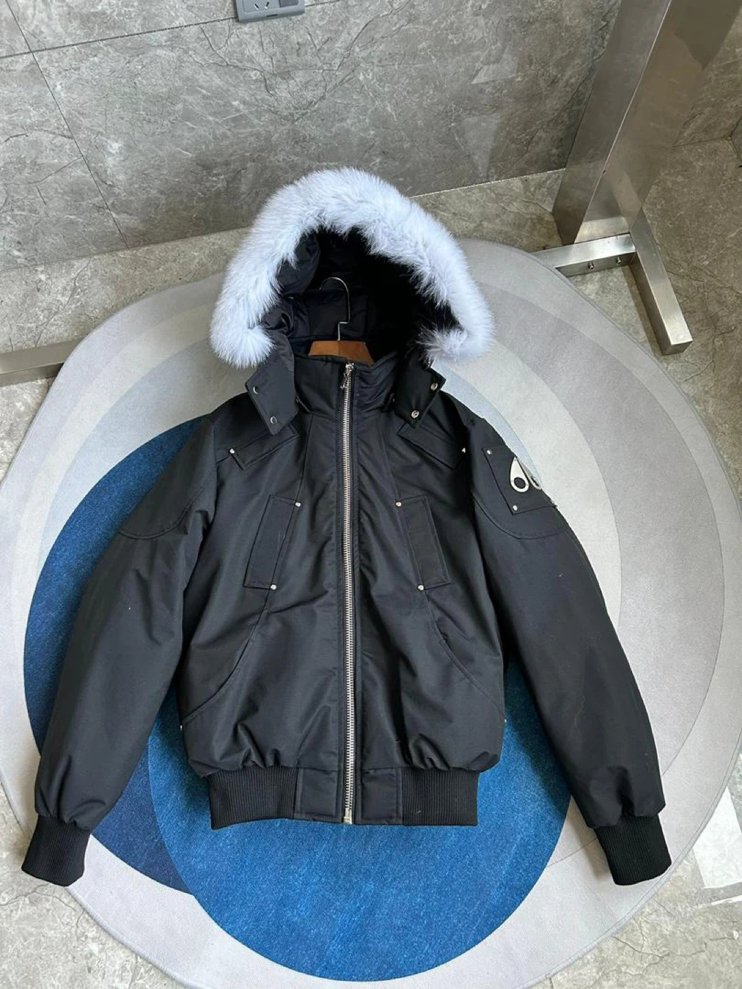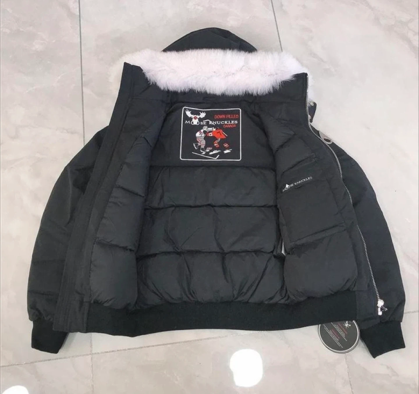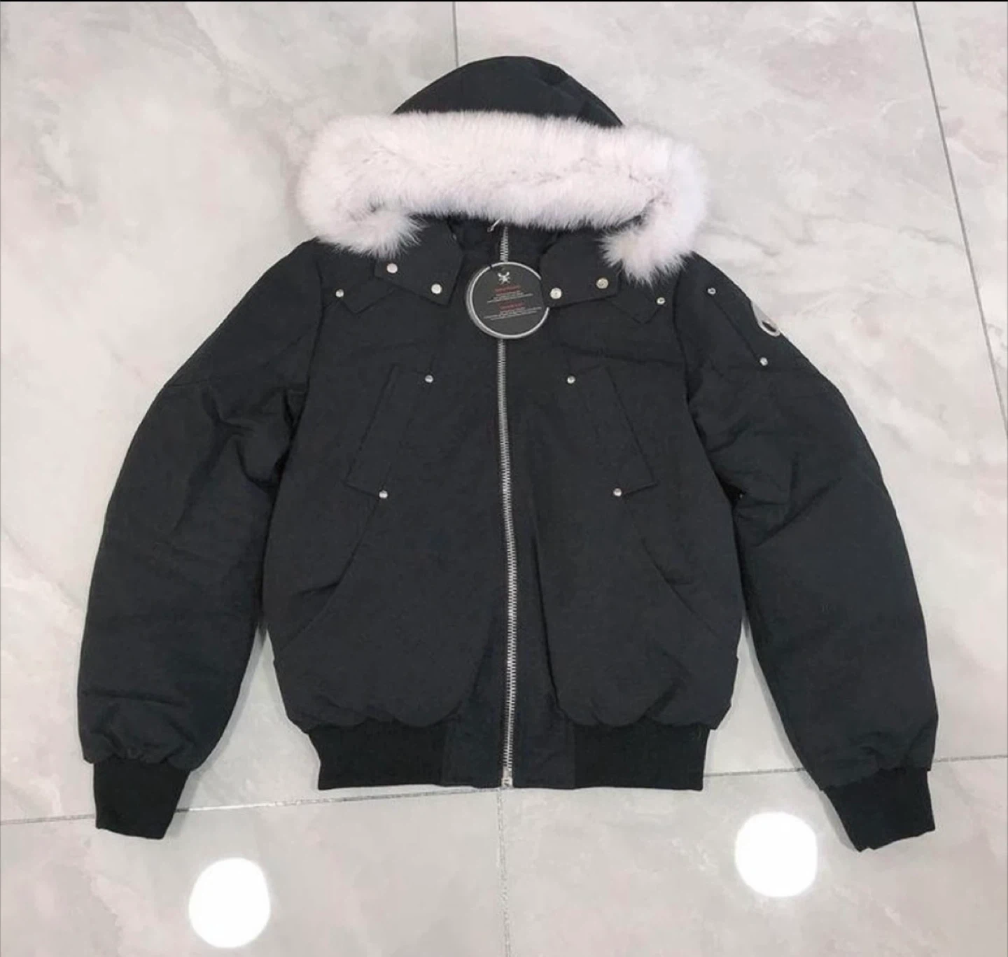 Selling a stylish Moose Knuckles black bomber jacket! It's in great condition and ready to keep you warm. The jacket features the iconic Moose Knuckles logo on the sleeve and a fur-trimmed hood for extra flair and warmth