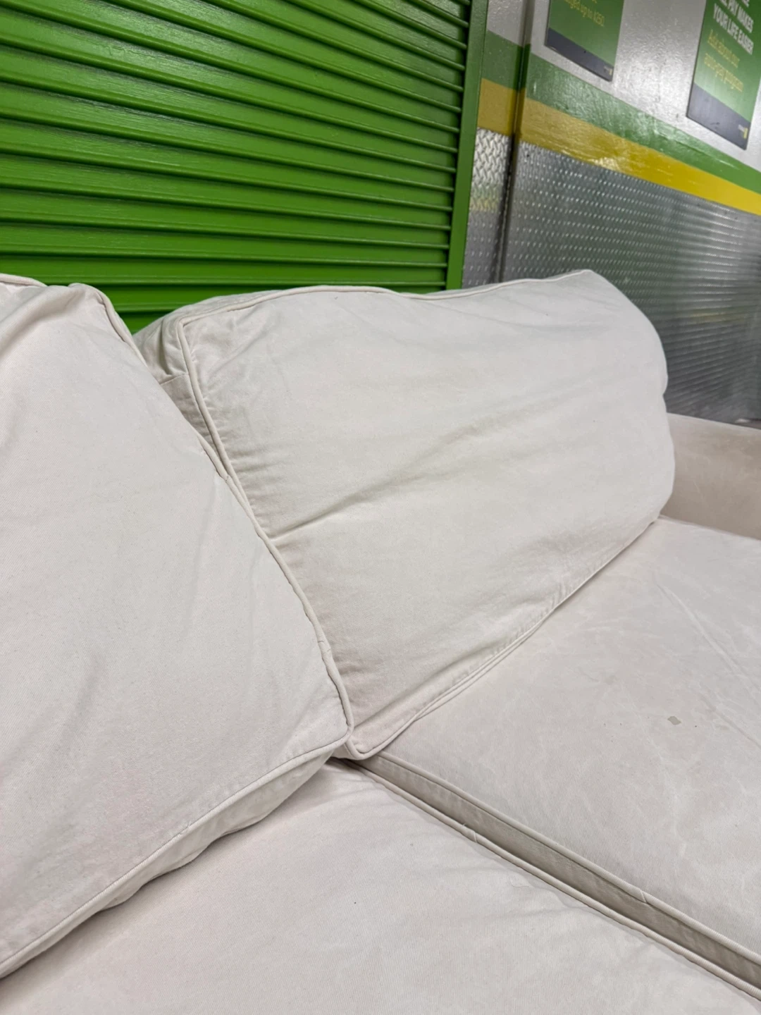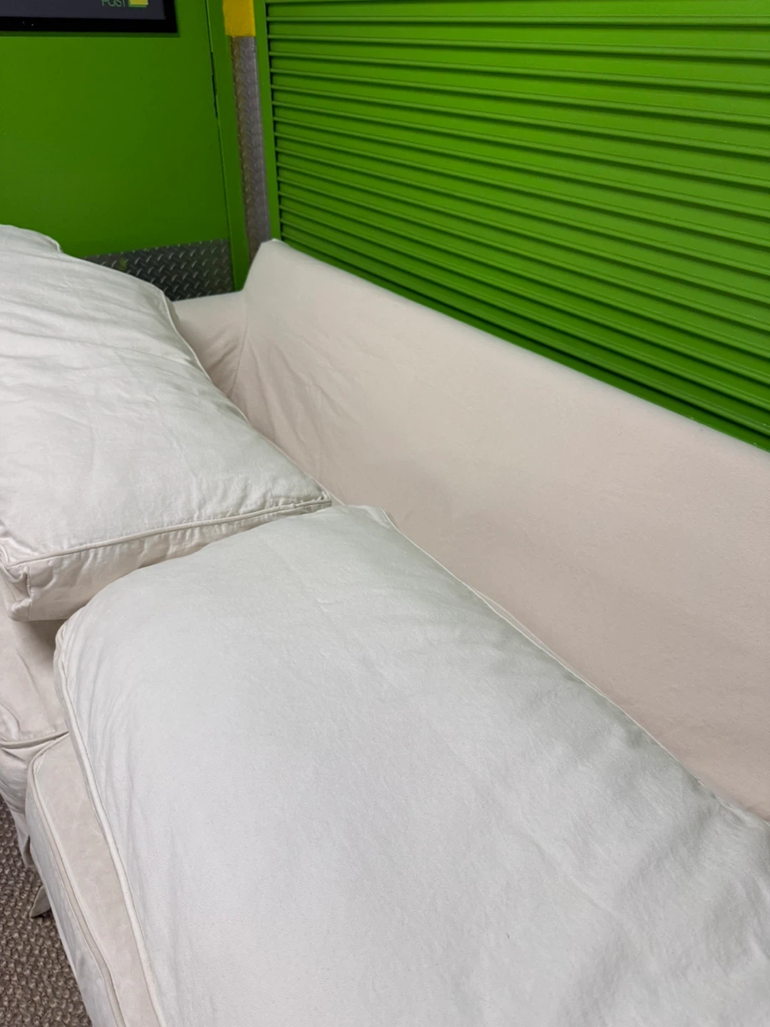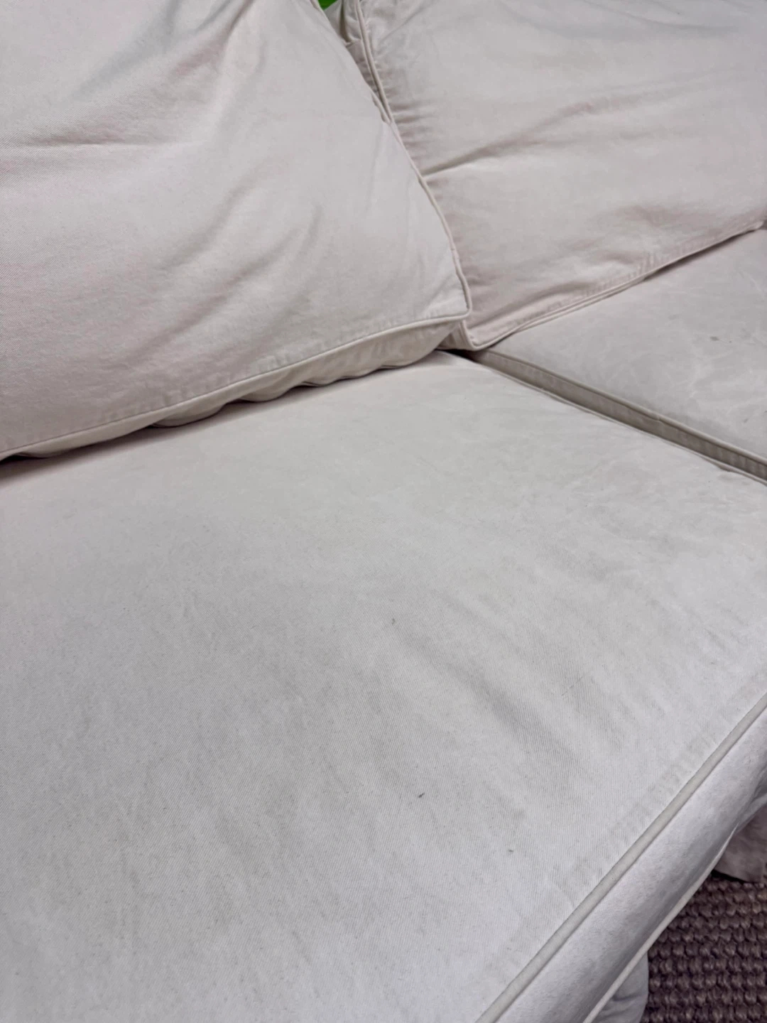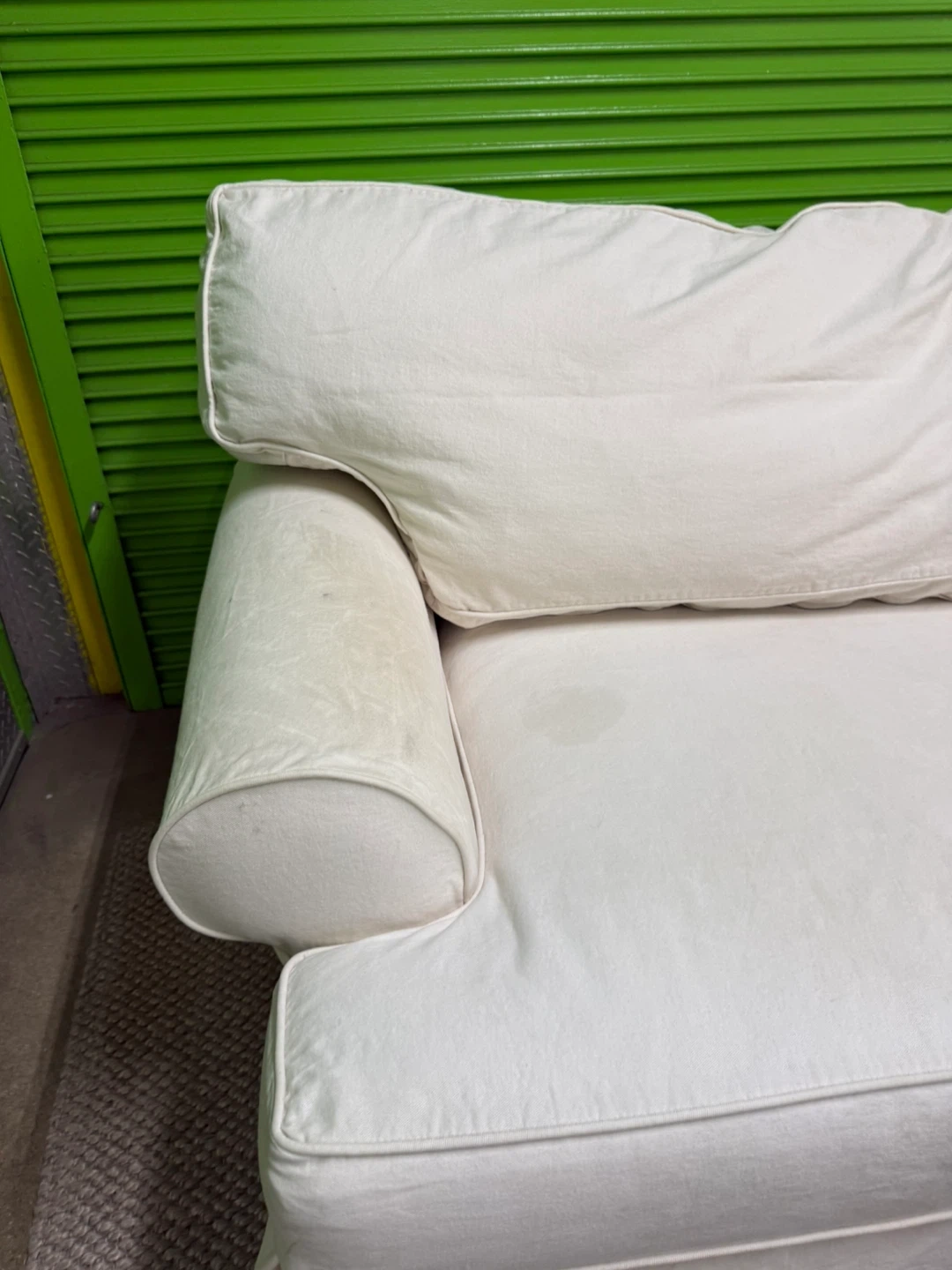 Very comfortable and spacious sofa with premium duck down filling for a soft, relaxed feel. Upholstered in washable linen fabric. There are some stains on the arm and seat area, as shown in the photos and video, but overall it’s in good shape.