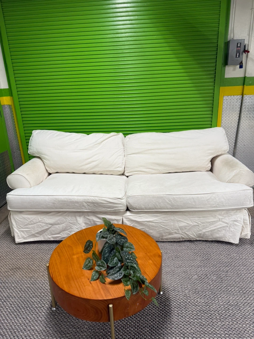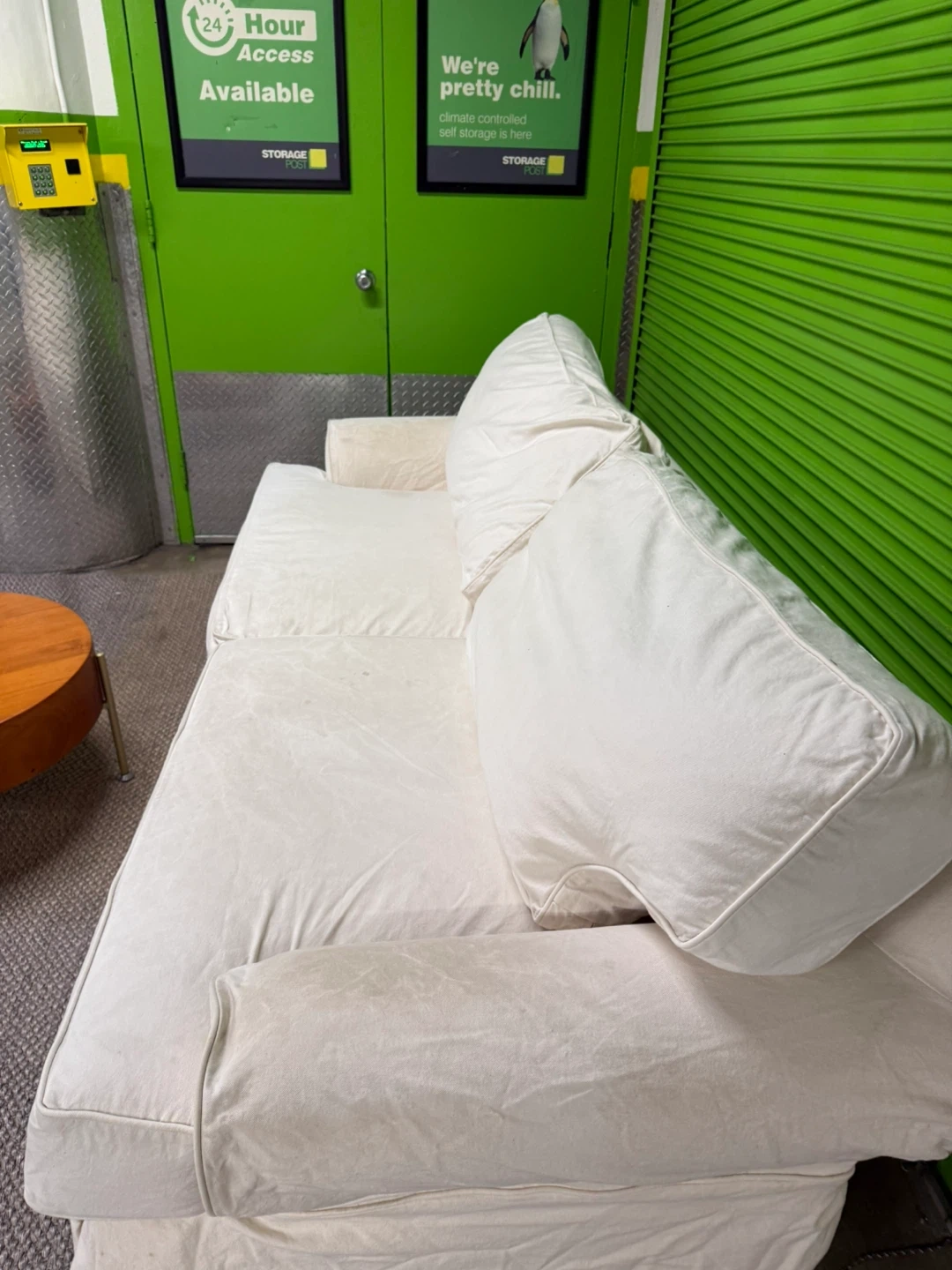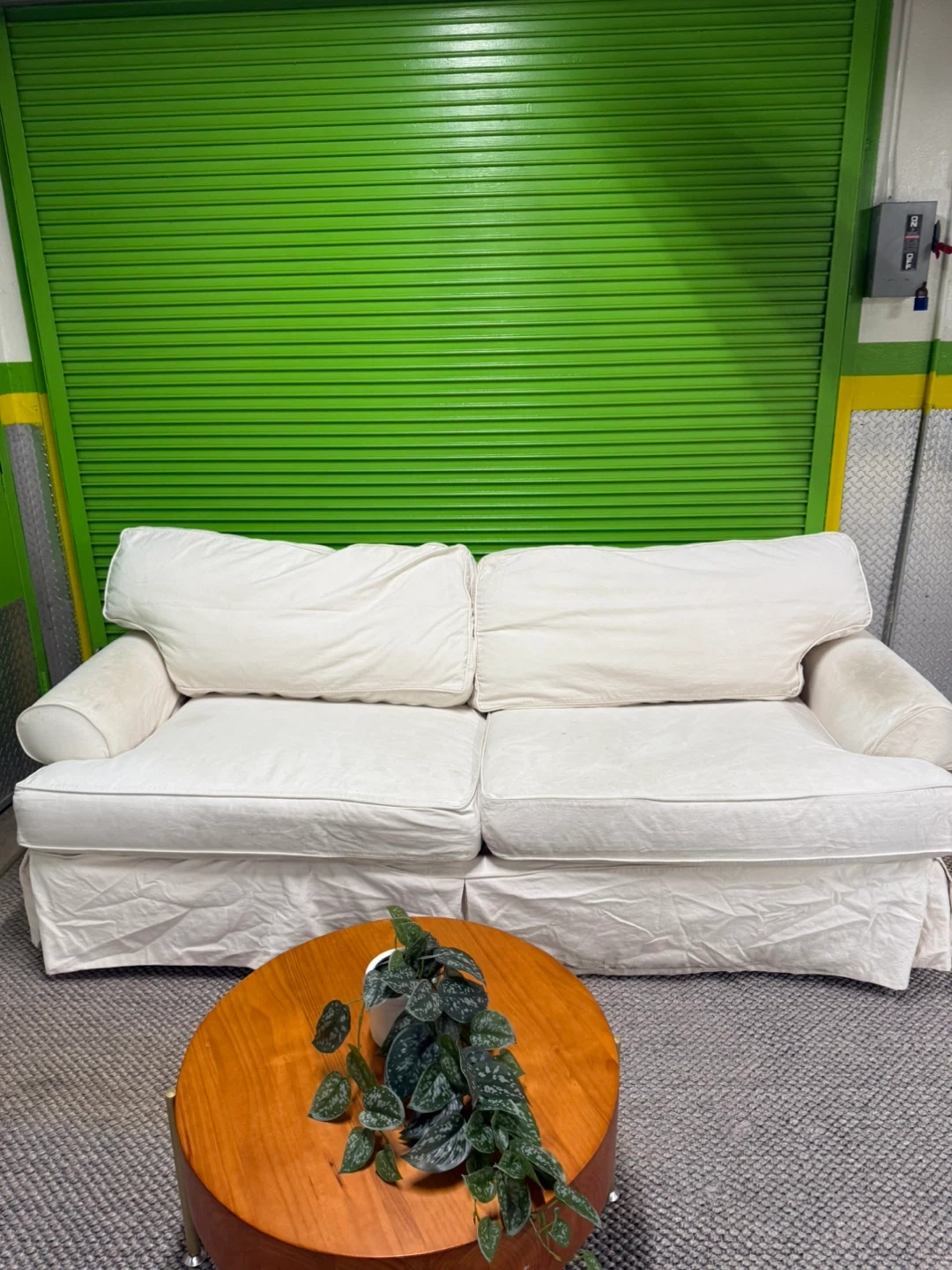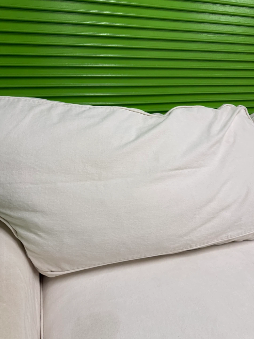 Very comfortable and spacious sofa with premium duck down filling for a soft, relaxed feel. Upholstered in washable linen fabric. There are some stains on the arm and seat area, as shown in the photos and video, but overall it’s in good shape.