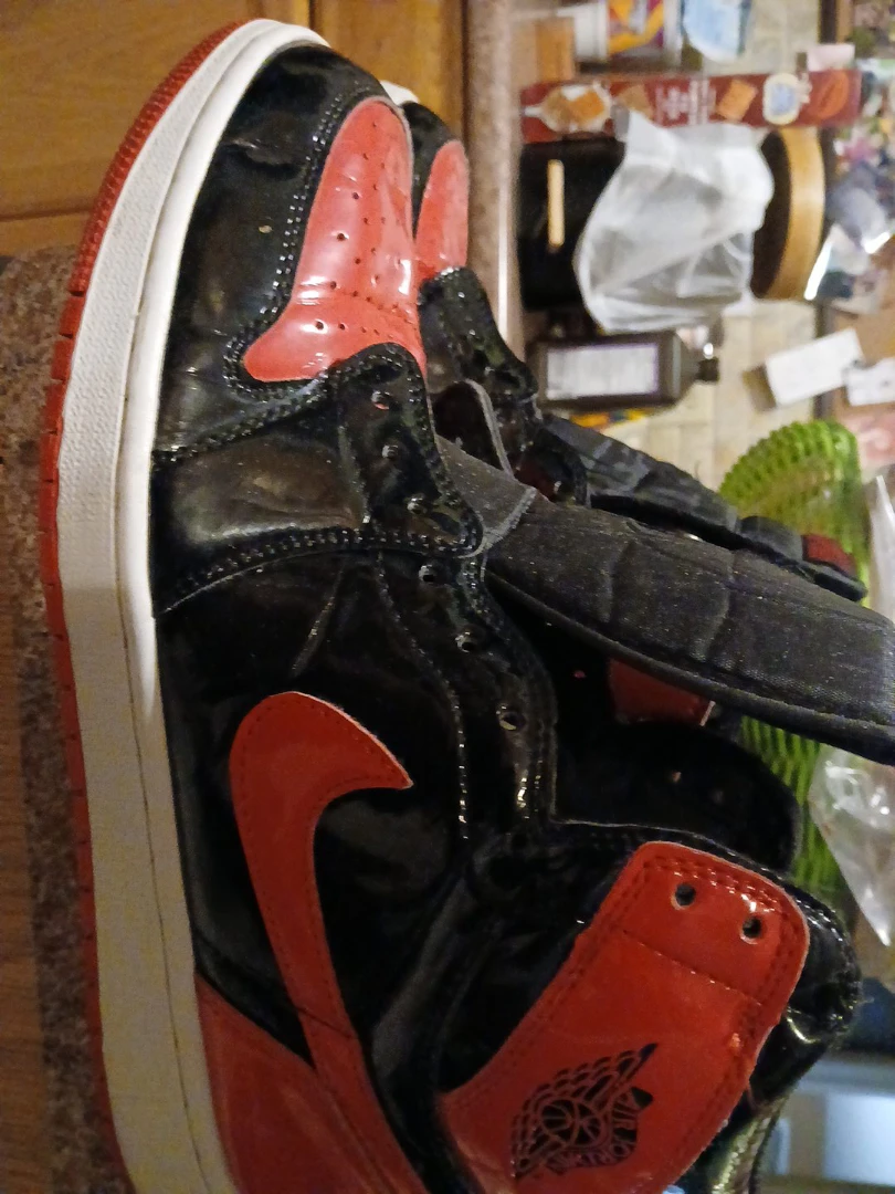 Selling a pair of Nike Air Jordan 1 Retro High Patent Bred sneakers! These shoes feature a glossy patent leather finish in the classic black and red colorway. A stylish addition to any sneaker collection!