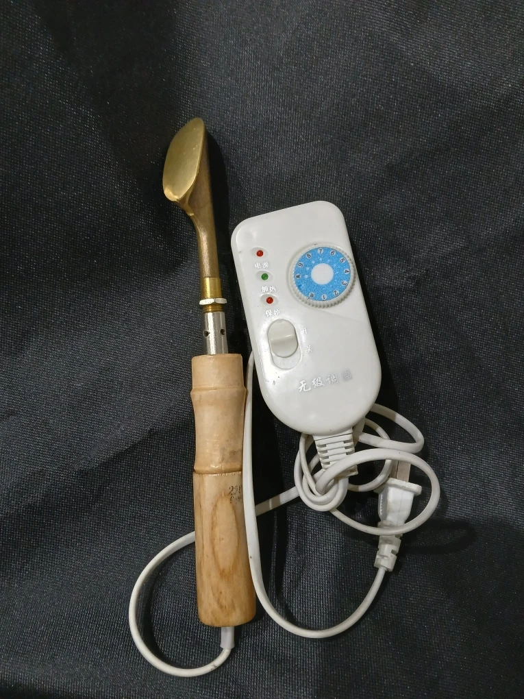 15I'm selling this massager that has a unique design. It features a metal head, a bamboo handle, and a dial controller. It appears to be in good condition and ready for use!