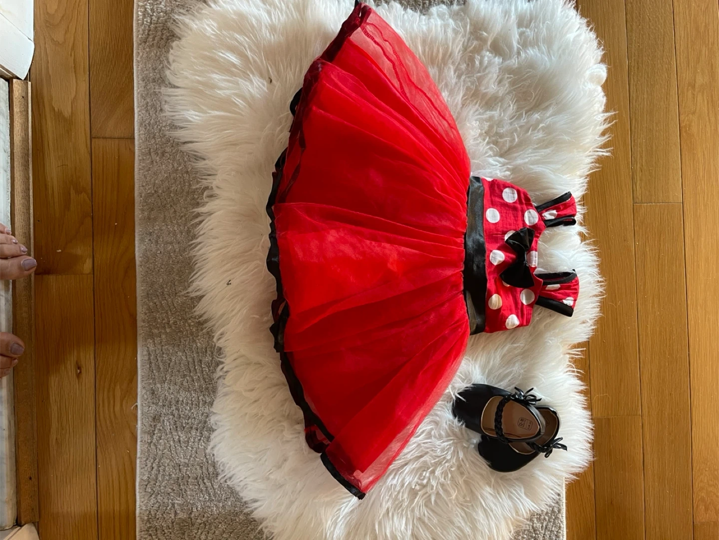 10Adorable Minnie Mouse costume dress with matching shoes! The dress is red with black trim and white polka dots, complete with a cute bow. Perfect for a little one who loves Minnie Mouse and dress-up!