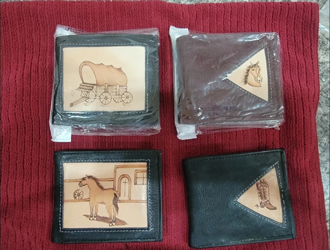 Selling a few handmade leather wallets with unique Mexican southwestern-themed designs! Each wallet features a different design, including a covered wagon, a horse, and a cowboy boot. They're new. Selling separately.