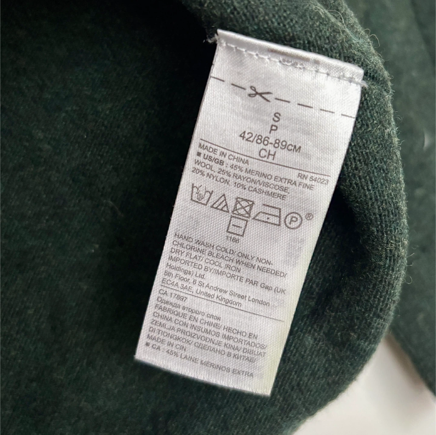 It's a size small and made from a blend of 45% merino extra fine wool, 26% rayon/viscose, 20% nylon, and 10% cashmere.