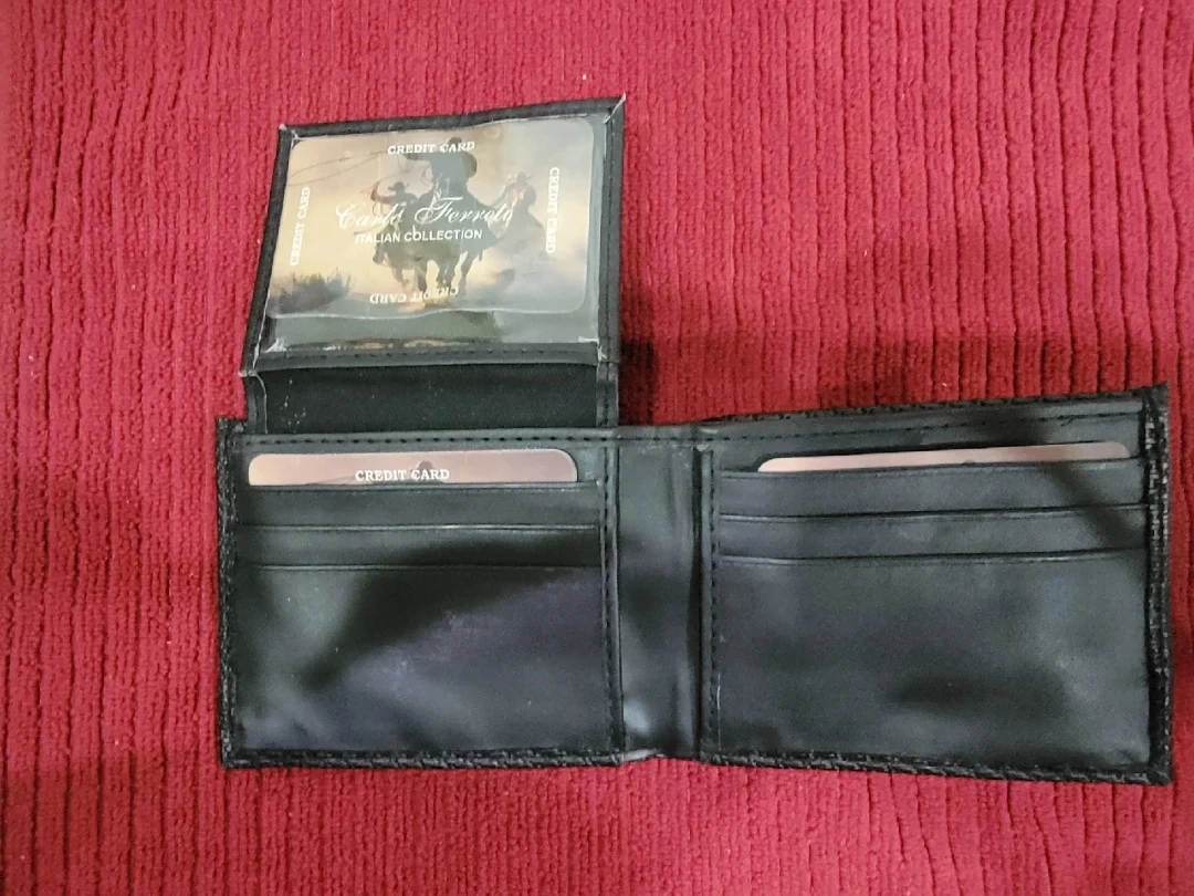 Selling a gently used Carlo Ferretti Italian Collection wallet! It is black and has a unique textured design on the exterior. Inside, there are slots for credit cards and a clear window for an ID. It's a stylish and functional accessory for everyday use