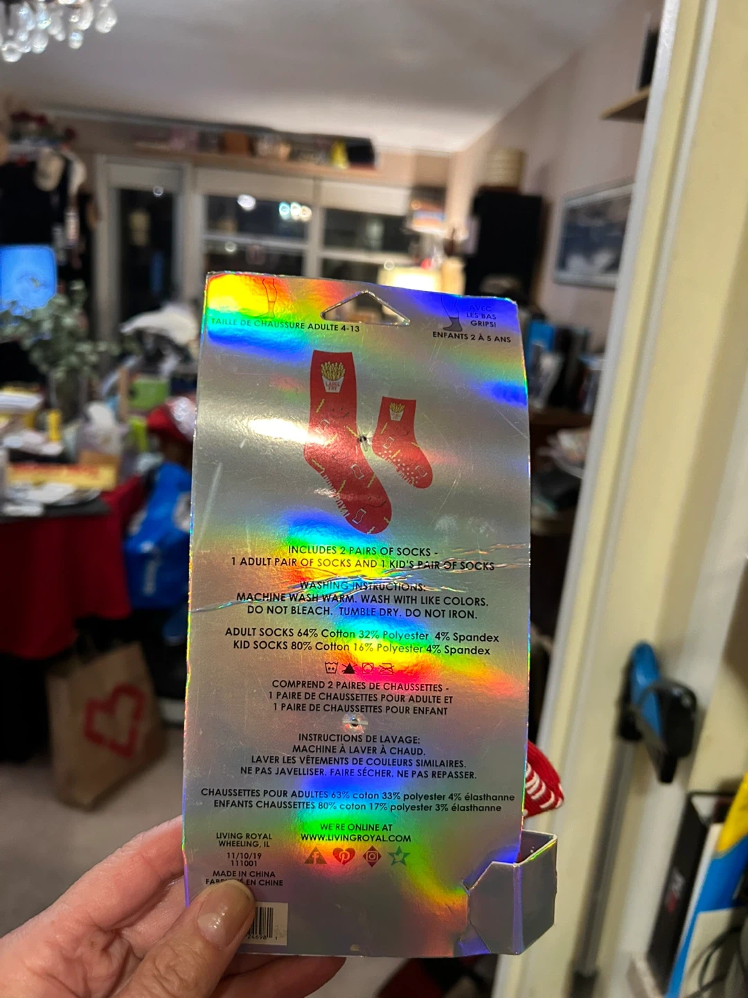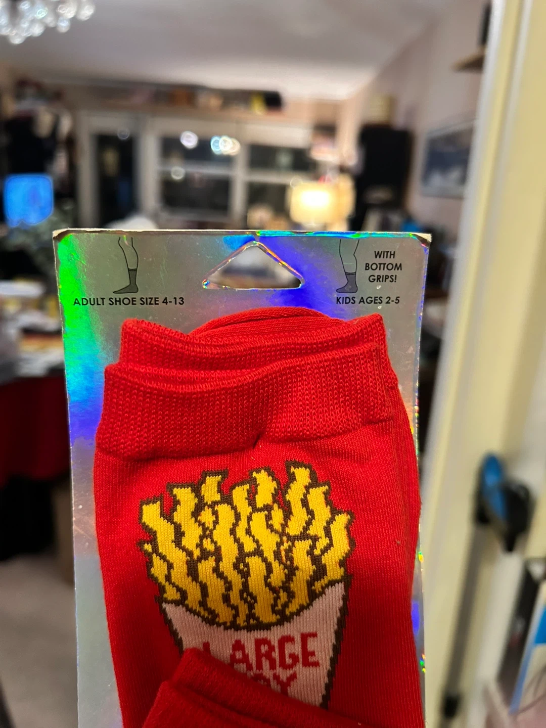 These are a pair of adorable matching socks! One pair is adult size 4-13 and the other is kids size for ages 2-5. They're bright red with a fun french fry design and even have grips on the bottom! Adult size says big fry, child size says little fry