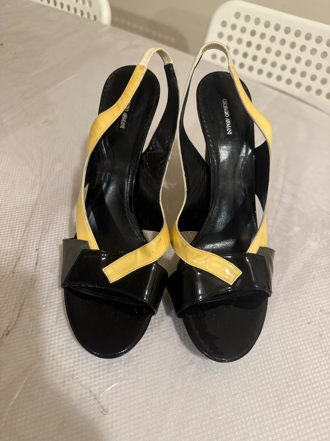 Selling a pair of Giorgio Armani heels! They feature a sleek black patent leather design with eye-catching yellow straps. These heels are perfect for adding a touch of elegance and style to any outfit