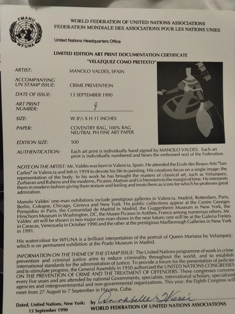 Selling a limited edition art print by Manolo Valdes. The print is from a watercolor and is a limited edition art print. The size is W 8 1/2 x H 11 inches. The paper is Coventry rag, 100% rag neutral pH fine art paper. Edition size is 500.