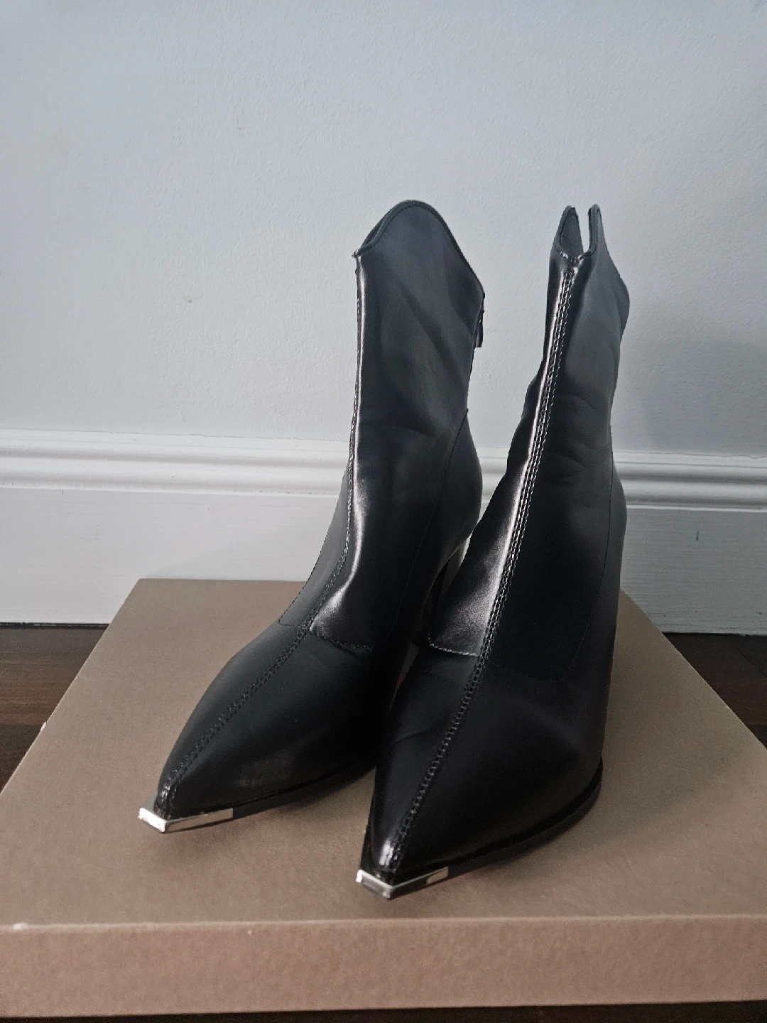 Selling a pair of black leather ankle boots from DeMaza. They're in great shape and ready for a new home! The boots feature a sleek design with a pointed toe and a comfortable heel height. Perfect for adding a touch of style to any outfit
