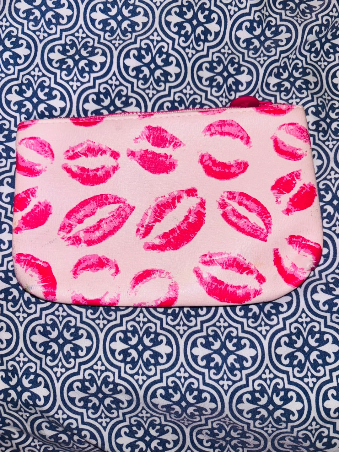 Cute pink cosmetic bag featuring a fun kiss print! It's perfect for storing your makeup or other small essentials. There is a small mark on the front. It's in good used condition and ready for a new home
