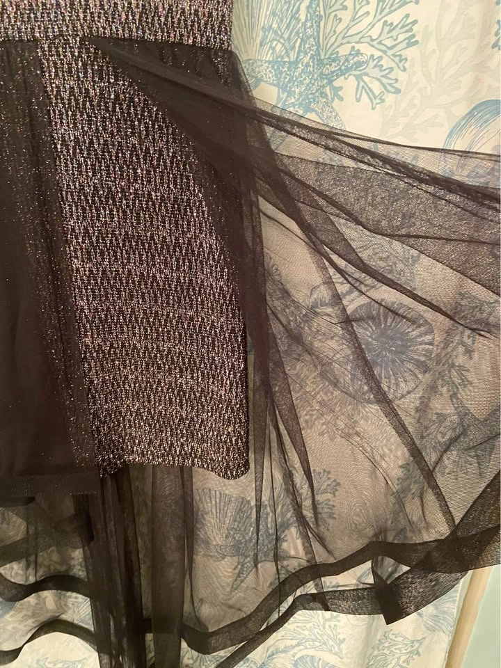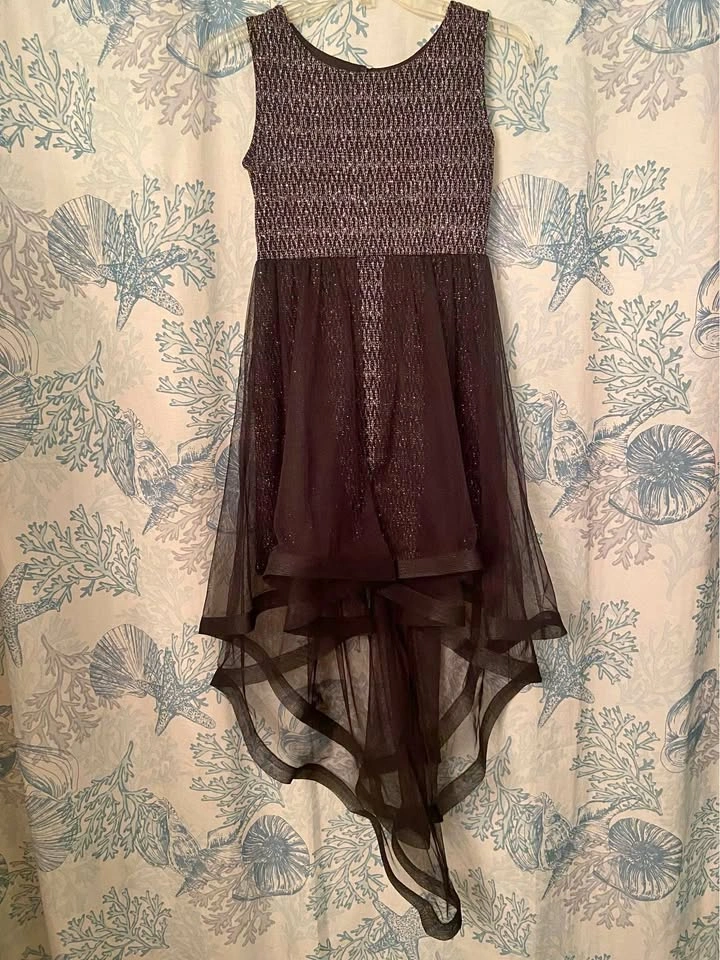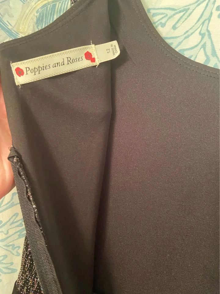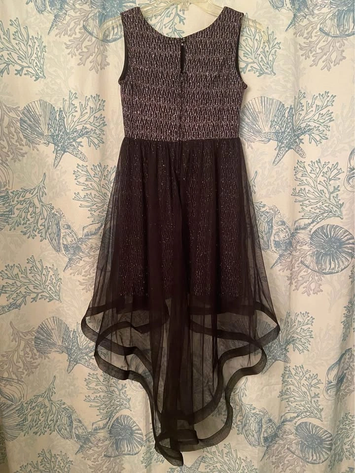 Girl’s black sparkly dress with stretchy body, size 12, by Poppies & Roses. Purchased from Von Maur. Glittery bodice with a high-low double layer tiered tulle outer-skirt. Dress is fully lined. Excellent used condition, worn once.
