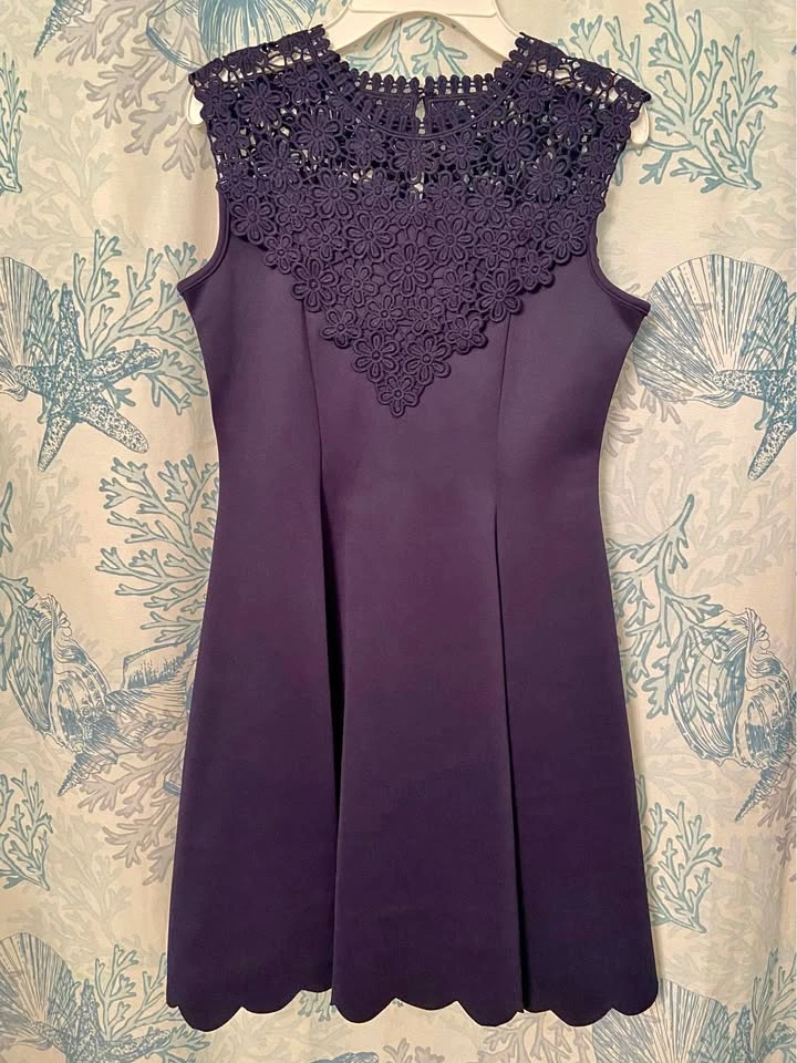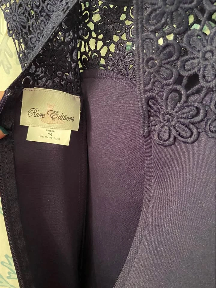Girl’s navy blue dress, size 14, by Rare Editions. Purchased from Von Maur. Sleeveless, with a scalloped bottom. Very good used condition, only worn once. Cash only.