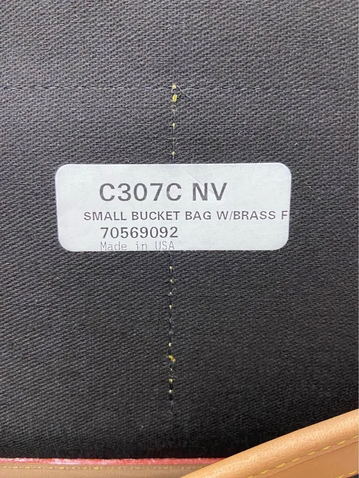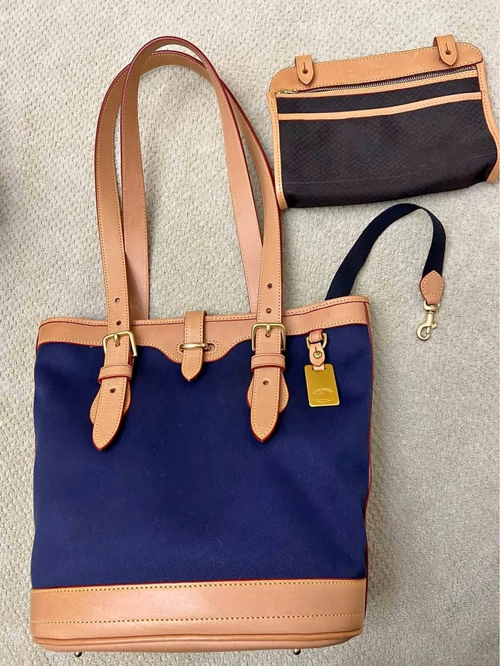 Serial # and style/model #’s in photos. Bucket bag exterior body is made of a thick navy blue canvas fabric that gives the bag structure. Blue exterior canvas body is in excellent condition. Bag has top closure with small leather tongue, in excellent condition. Has tan leather trim, double-handle leather straps, and a structured leather bottom. Interior of bag is black-colored canvas, excellent condition and very clean…no stains, tears or scratches. Has an attached black fabric key clasp with leather detail. There is a removable tan leather/black canvas pouch attached to the inside with three slip pockets, also in excellent condition. Has leather strap attachments for a second pouch to hang on opposite side. I am including a second matching D & B pouch that was purchased as an accessory to be used with this bag… It can be attached to the interior opposite side of the existing pouch. It is matching black canvas with tan leather, and has a full zip pocket and a slip pocket. Bag has dual brass buckles with adjustable/removable tan leather straps, in excellent condition, no dark areas/staining from hands. Has bright gold-tone brass hanging duck tag, and four protective feet on bottom of bag. All brass hardware.