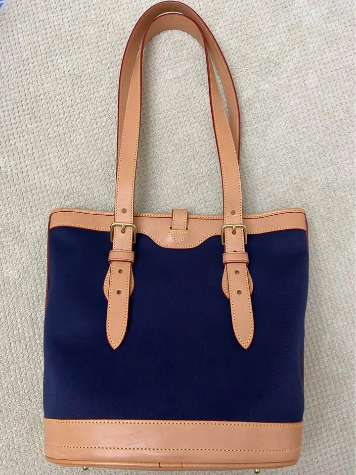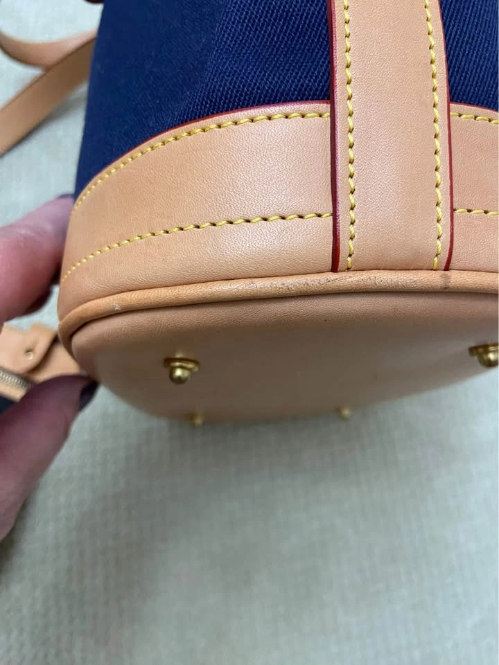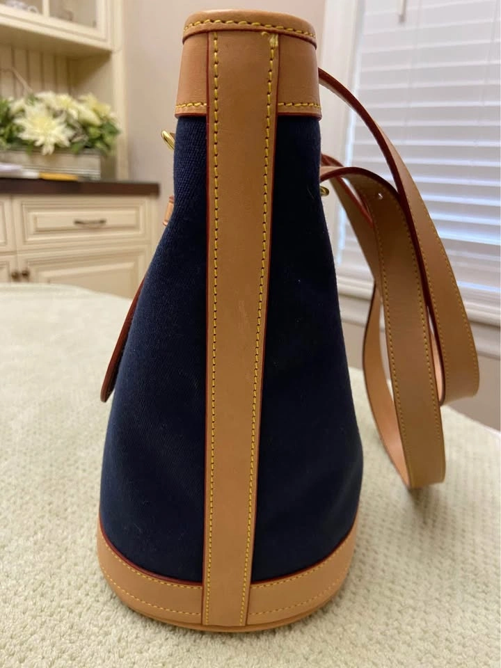 Vintage Dooney & Bourke Cabriolet Bucket Bag, in Navy Blue canvas and British Tan Leather. Bag is officially named, “Small Bucket Bag with Brass Feet”, part of D&B’s Cabriolet Collection. The bag is actually more of a medium size.