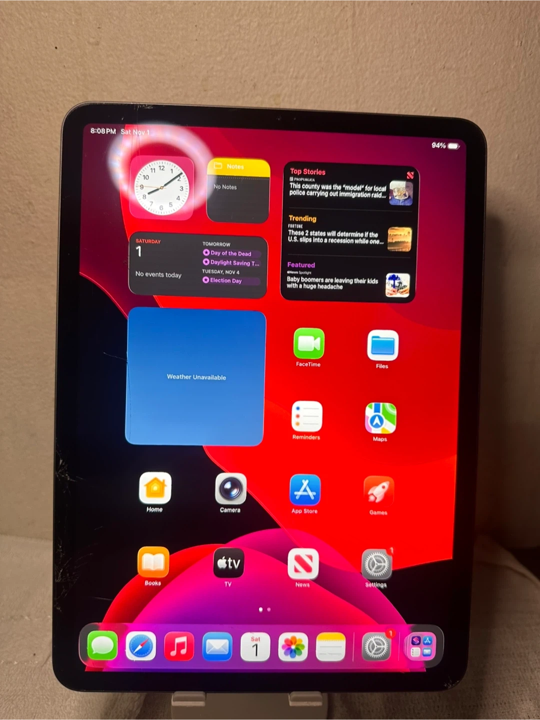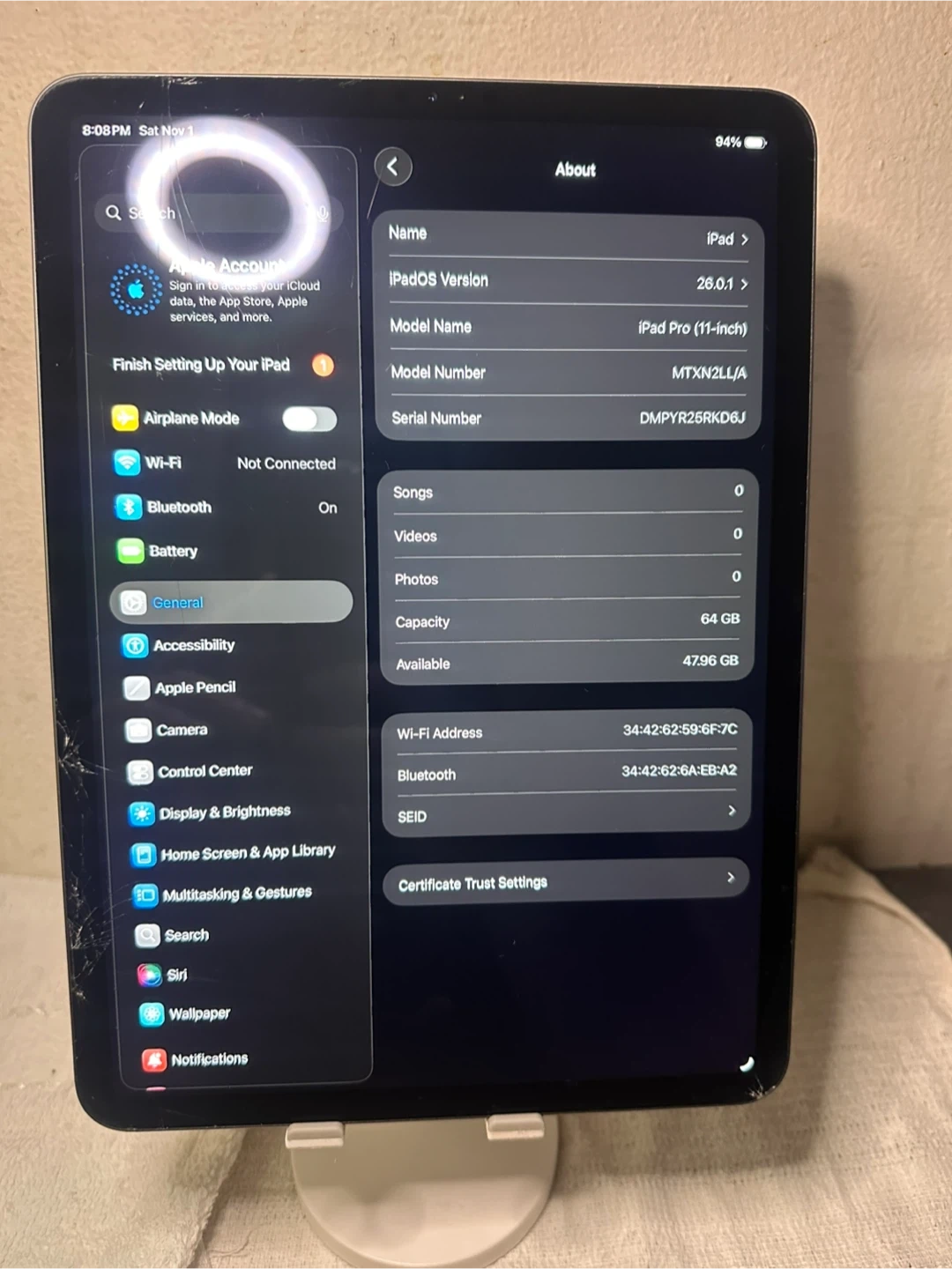 101iPad Pro 11 Inch Color: Black Storage: 64GB Model Number: MTXN2LL/A Serial Number: DMPYR25RKD6J No Box No Charger Cracked Screen Local pick up by Sutton place, all sales are final.