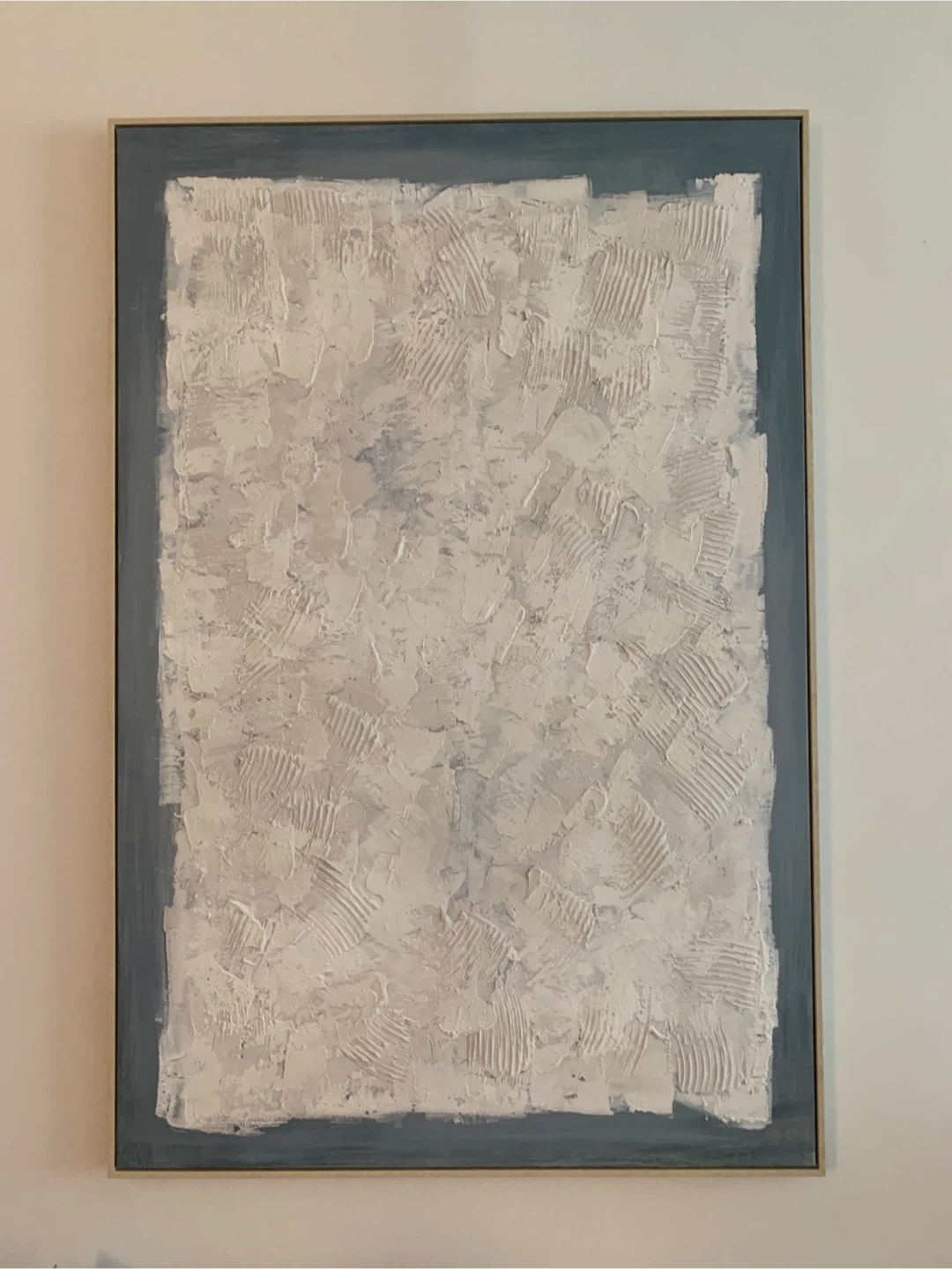 I'm selling a beautiful, abstract textured wall art piece. The artwork features a calming blend of neutral and gray tones with a textured surface that adds depth and visual interest. It measures approximately 41 inches in width and 59 inches in height, making it a substantial piece to enhance any room. The frame complements the artwork with its simple, natural finish.