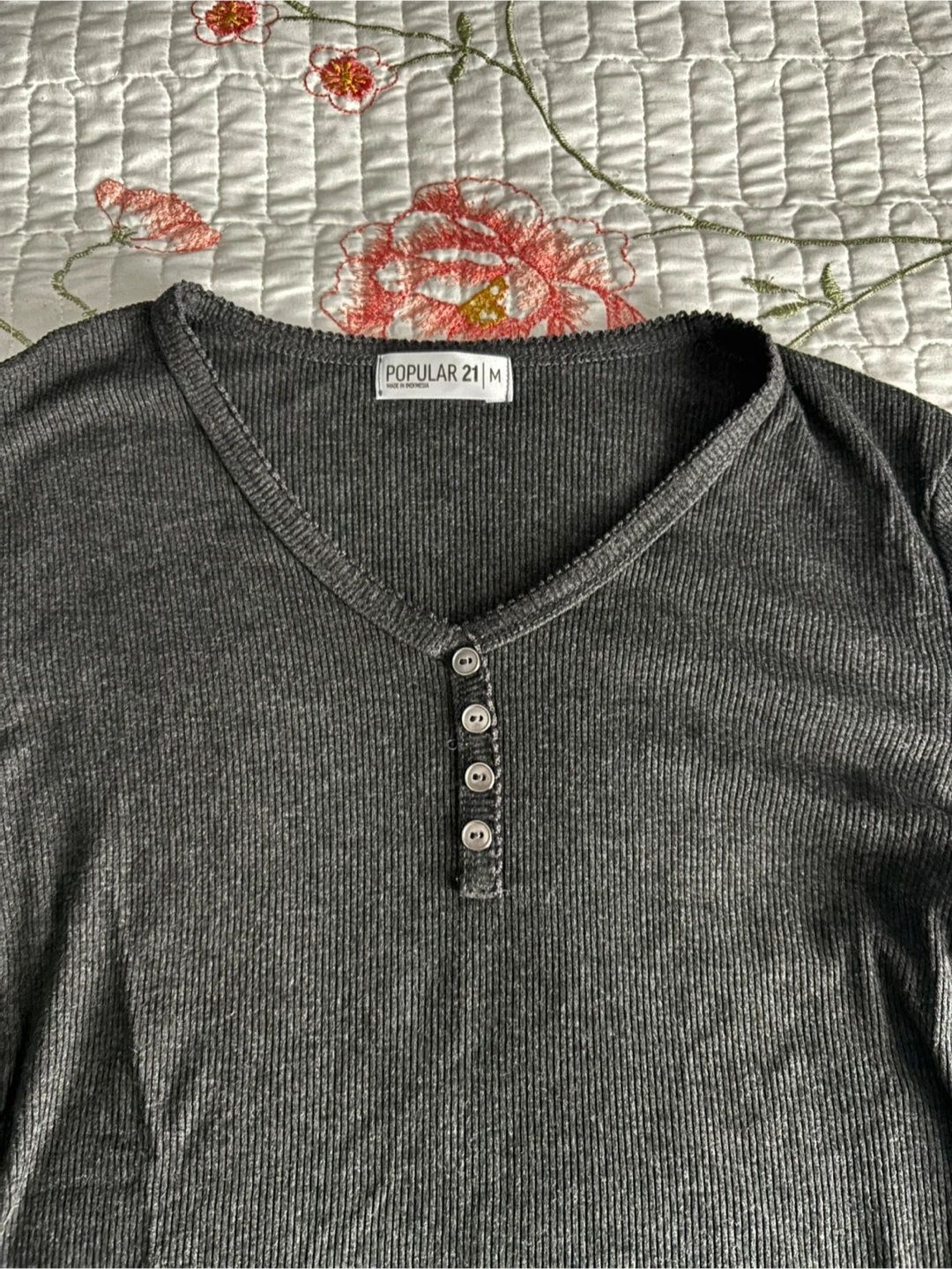 Selling a charcoal gray long-sleeve top from Popular 21 in size medium. It features a V-neck with button detailing and a ribbed texture. The material is soft and comfortable, perfect for layering or wearing on its own!