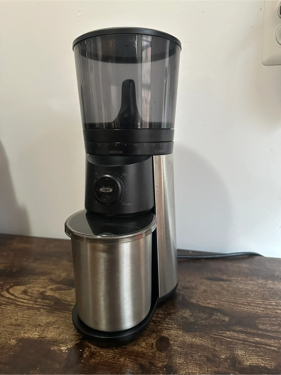 Selling an OXO Brew Conical Burr Coffee Grinder! It's in great condition and ready to help you make the perfect cup of coffee at home. This grinder is known for its consistent grind size, which is essential for a balanced and flavorful brew. It has adjustable settings to grind for everything from espresso to French press.