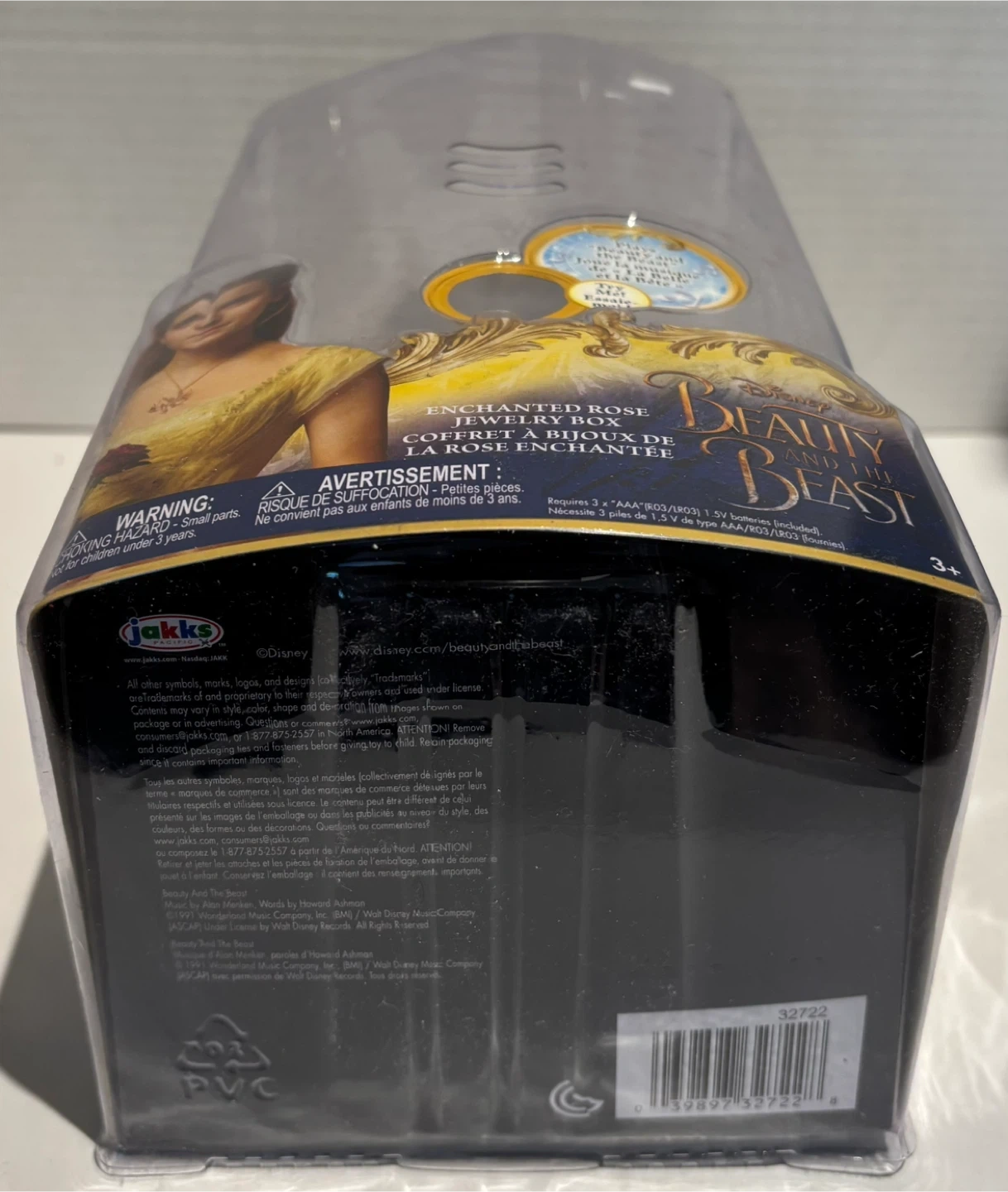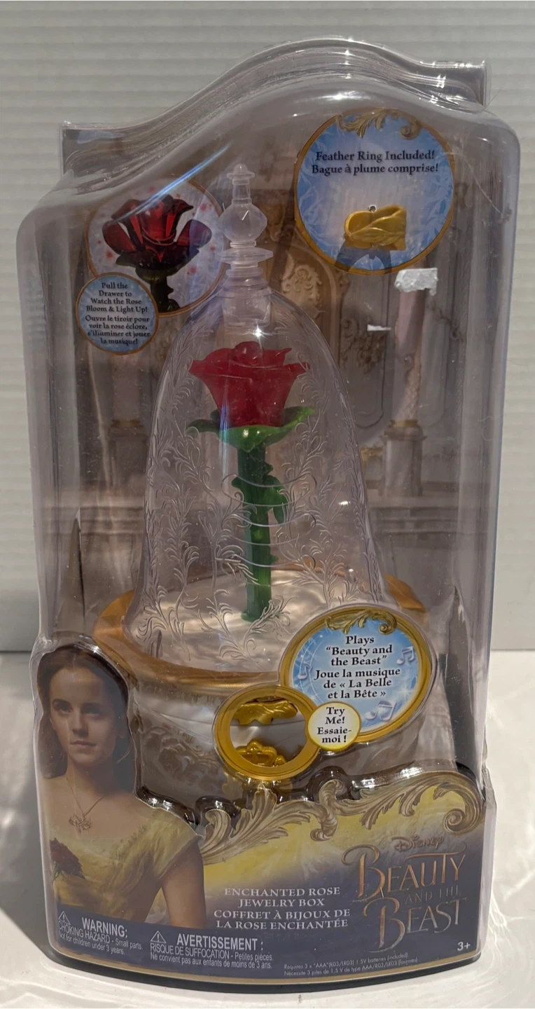 140This is a lovely Beauty and the Beast Enchanted Rose Jewelry Box! It plays "Beauty and the Beast" and lights up. The box includes a feather ring.