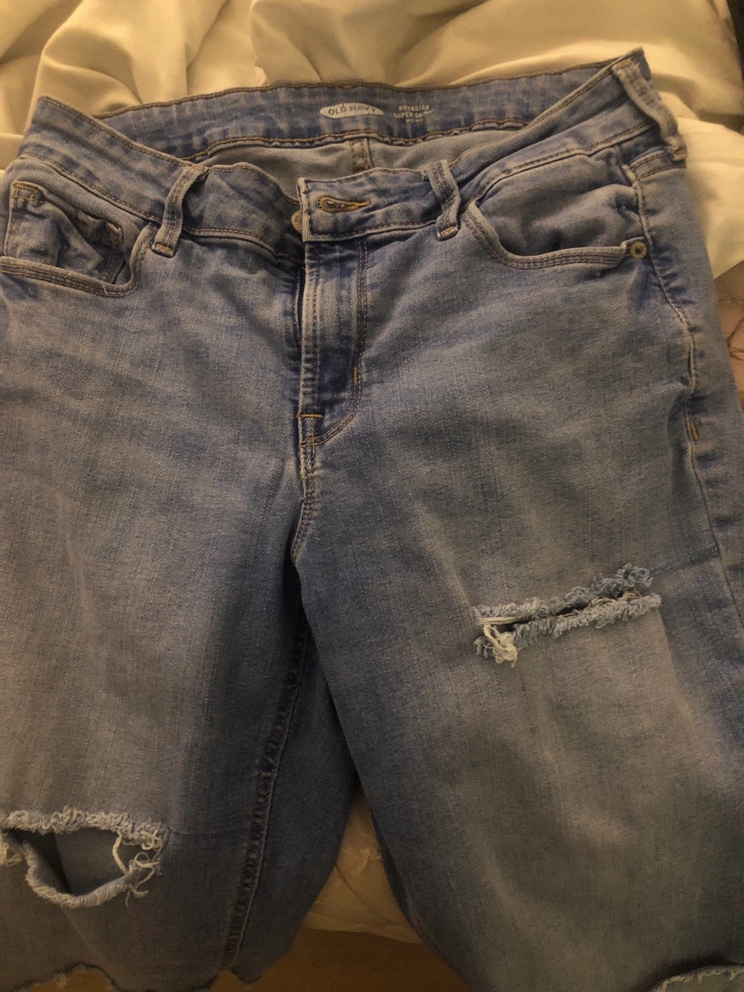 These are Old Navy Rockstar Super Skinny jeans in a light blue wash. They feature distressed rips on the front and hem. Size is 6